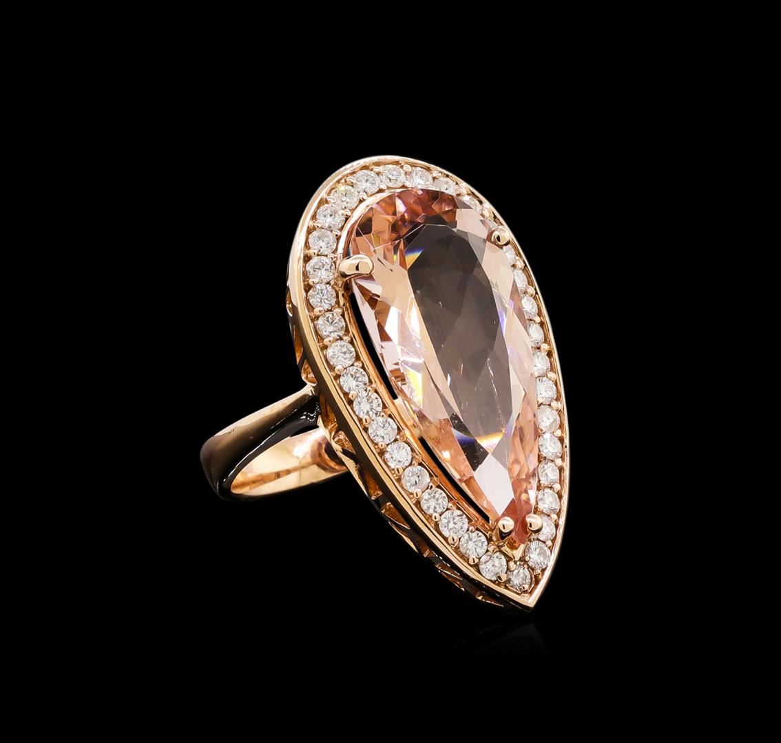 One electronically tested 14KT rose gold lady's cast fashion ring with a halo with a bright polish finish. The featured lady's ring has a shank measuring 3.40 millimeters wide. Identified with markings of "K14". Condition is new, good workmanship. Containing: One prong set pear modified brilliant cut natural morganite, measuring 23.25 x 10.90 x 6.53mm, approximate weight of 8.52ct., clarity is eye clean, type I, light, very slightly brownish, orangy red color, (GIA oR 3/3), cut is very good. Transmitting light with no distortion, transparent. Colored gemstones are presumed to have been subjected to commonly used enhancement processes. Graded in the setting. Thirty-Five prong set round brilliant cut diamonds, measuring 1.80 - 1.70 x 1.10mm (depth est.) approximate total weight of 35 Stones = 0.72ct. Graded in the setting. Clarity: SI-1 to I-1. Color: H - I. Cut Good. Total Weight of Colored Stones 8.52ct. Total Weight of Diamonds 0.72ct. Total Weight of Ring 10.50gm. GAS Appraised at $8,175.00.