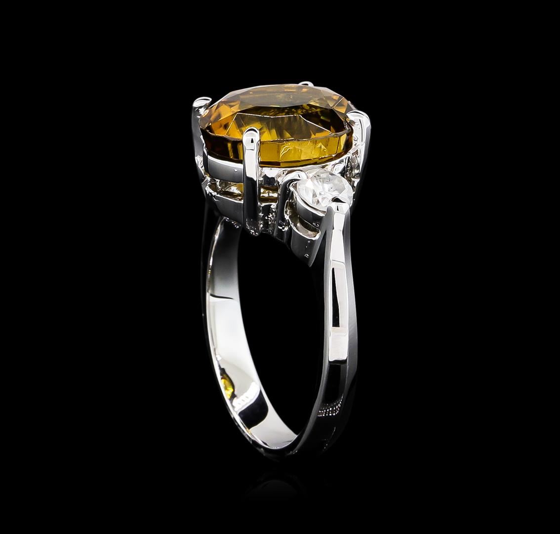One polished, stamped, and tested 14KT white gold ring mounted with: 1 genuine zircon center stone weighing 8.53ct, and 2 genuine round diamonds weighing 0.52ct. This item weighs 6.80 grams, condition is new, excellent workmanship. MAIN GEMSTONE: Species: Zircon. Shape: Oval. Cutting Style: Brilliant cut crown; step cut pavilion. Measurements: 11.6 x 7.8 x 7.0mm. Weight: 8.53ct. Color: Brownish orange. Cut Grade: Very good. Refractive Index: OTL DR. Optic Character: Uniaxial positive. Hardness: 6.5. ADJACENT GEMSTONES ON RING: Identity: Natural Diamond. Shape: Round. Cutting Style: Brilliant cut. Quantity: 2 diamonds. Average Diameter: 3.8mm. Total Weight: 0.52ct. Clarity Grade: I1. Color Grade: H. Refractive Index: 2.418. Hardness: 10. AIGL Appraised at $5,000.00.