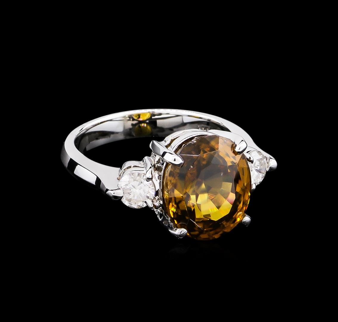 One polished, stamped, and tested 14KT white gold ring mounted with: 1 genuine zircon center stone weighing 8.53ct, and 2 genuine round diamonds weighing 0.52ct. This item weighs 6.80 grams, condition is new, excellent workmanship. MAIN GEMSTONE: Species: Zircon. Shape: Oval. Cutting Style: Brilliant cut crown; step cut pavilion. Measurements: 11.6 x 7.8 x 7.0mm. Weight: 8.53ct. Color: Brownish orange. Cut Grade: Very good. Refractive Index: OTL DR. Optic Character: Uniaxial positive. Hardness: 6.5. ADJACENT GEMSTONES ON RING: Identity: Natural Diamond. Shape: Round. Cutting Style: Brilliant cut. Quantity: 2 diamonds. Average Diameter: 3.8mm. Total Weight: 0.52ct. Clarity Grade: I1. Color Grade: H. Refractive Index: 2.418. Hardness: 10. AIGL Appraised at $5,000.00.