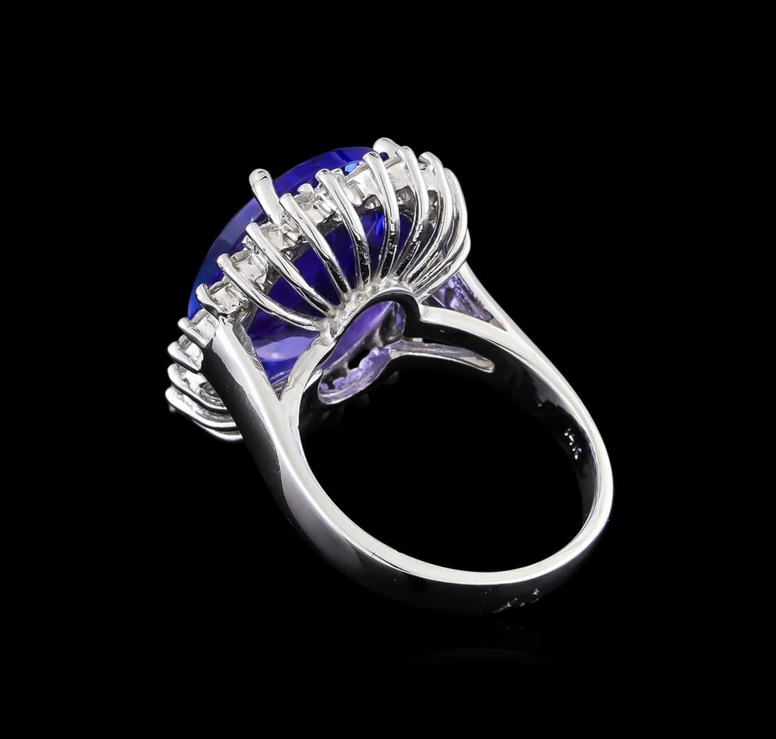 One electronically tested 14KT white gold ladies cast tanzanite and diamond ring with a bright polish finish. The featured tanzanite is set within a diamond floret supported by a ribbed under gallery, completed by a two millimeter wide band. Identified with markings of "14K". Condition is new, good workmanship. Containing: One prong set oval mixed cut natural tanzanite, measuring 15.70 x 11.90 x 6.50mm, approximate weight of 8.58ct., clarity is eye clean, type I, medium dark, very slightly grayish, bluish violet color, (GIA bV 6/3), cut is good. Transmitting light with no distortion, transparent. Colored Stone Grading Report attached. Graded in the setting. Tanzanite is a very rare gemstone that is only found in the country of Tanzania. Originally discovered in 1967. Tiffany & Company, named the stone Tanzanite. It is found in the Usumburu Mountains that border the Umba Valley of northern Tanzania. Tanzanite occurs in gray, brown, violet, blue, reddish-purple, & green. The gem is interesting because of its exceptional pleochroism. Rotated in different directions a tanzanite will exhibit multiple changes of color. Tanzanite has a low tolerance to ultrasonic cleaning, and should not be cleaned using this method. Twenty-Four prong set round brilliant cut diamonds, measuring 1.90 - 1.90 x 1.14mm (depth est.) approximate total weight of 24 Stones = 0.61ct. Graded in the setting. Clarity: SI-2 to I-2. Color: G - I. Total Weight of Colored Stones 8.58ct. Total Weight of Diamonds 0.61ct. Total Weight of Ring 8.43gm. AIG Appraised at $21,090.00.