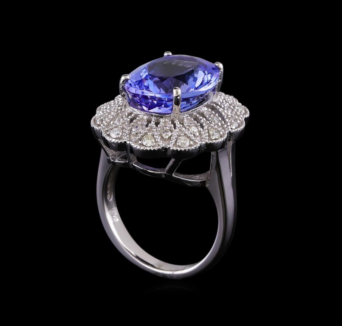 One electronically tested 14KT white gold lady's cast fashion ring with a basket halo with a bright polish with milgrain detailing finish. The featured lady's has a shank measuring 2.78 millimeters in width. Identified with markings of "K14". Condition is new, good workmanship. Containing: One prong set oval modified brilliant cut natural tanzanite, measuring 14.45 x 11.38 x 7.97mm, (depth est.) approximate weight of 8.58ct., clarity is eye clean, medium light, very slightly grayish, violetish blue color, (GIA vB 4/3), cut is good. Transmitting light with no distortion, transparent. Colored gemstones are presumed to have been subjected to commonly used enhancement processes. Graded in the setting. Twelve prong set round brilliant cut diamonds, measuring 1.80 - 1.75 x 1.11mm (depth est.) approximate total weight of 12 Stones = 0.26ct. Graded in the setting. Clarity: SI-1 to SI-2. Color: G - Good Twelve prong set round brilliant cut diamonds, measuring 1.50 - 1.40 x 0.90mm (depth est.) approximate total weight of 12 Stones = 0.14ct. Graded in the setting. Clarity: SI-1 to SI-2. Color: G - Good. Total Weight of Colored Stones 8.58ct. Total Weight of Diamonds 0.40ct. Total Weight of Ring 10.10gm. GAS Appraised.