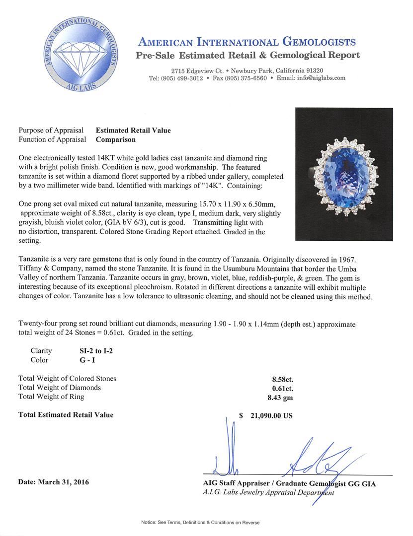 One electronically tested 14KT white gold ladies cast tanzanite and diamond ring with a bright polish finish. The featured tanzanite is set within a diamond floret supported by a ribbed under gallery, completed by a two millimeter wide band. Identified with markings of "14K". Condition is new, good workmanship. Containing: One prong set oval mixed cut natural tanzanite, measuring 15.70 x 11.90 x 6.50mm, approximate weight of 8.58ct., clarity is eye clean, type I, medium dark, very slightly grayish, bluish violet color, (GIA bV 6/3), cut is good. Transmitting light with no distortion, transparent. Colored Stone Grading Report attached. Graded in the setting. Tanzanite is a very rare gemstone that is only found in the country of Tanzania. Originally discovered in 1967. Tiffany & Company, named the stone Tanzanite. It is found in the Usumburu Mountains that border the Umba Valley of northern Tanzania. Tanzanite occurs in gray, brown, violet, blue, reddish-purple, & green. The gem is interesting because of its exceptional pleochroism. Rotated in different directions a tanzanite will exhibit multiple changes of color. Tanzanite has a low tolerance to ultrasonic cleaning, and should not be cleaned using this method. Twenty-Four prong set round brilliant cut diamonds, measuring 1.90 - 1.90 x 1.14mm (depth est.) approximate total weight of 24 Stones = 0.61ct. Graded in the setting. Clarity: SI-2 to I-2. Color: G - I. Total Weight of Colored Stones 8.58ct. Total Weight of Diamonds 0.61ct. Total Weight of Ring 8.43gm. AIG Appraised at $21,090.00.