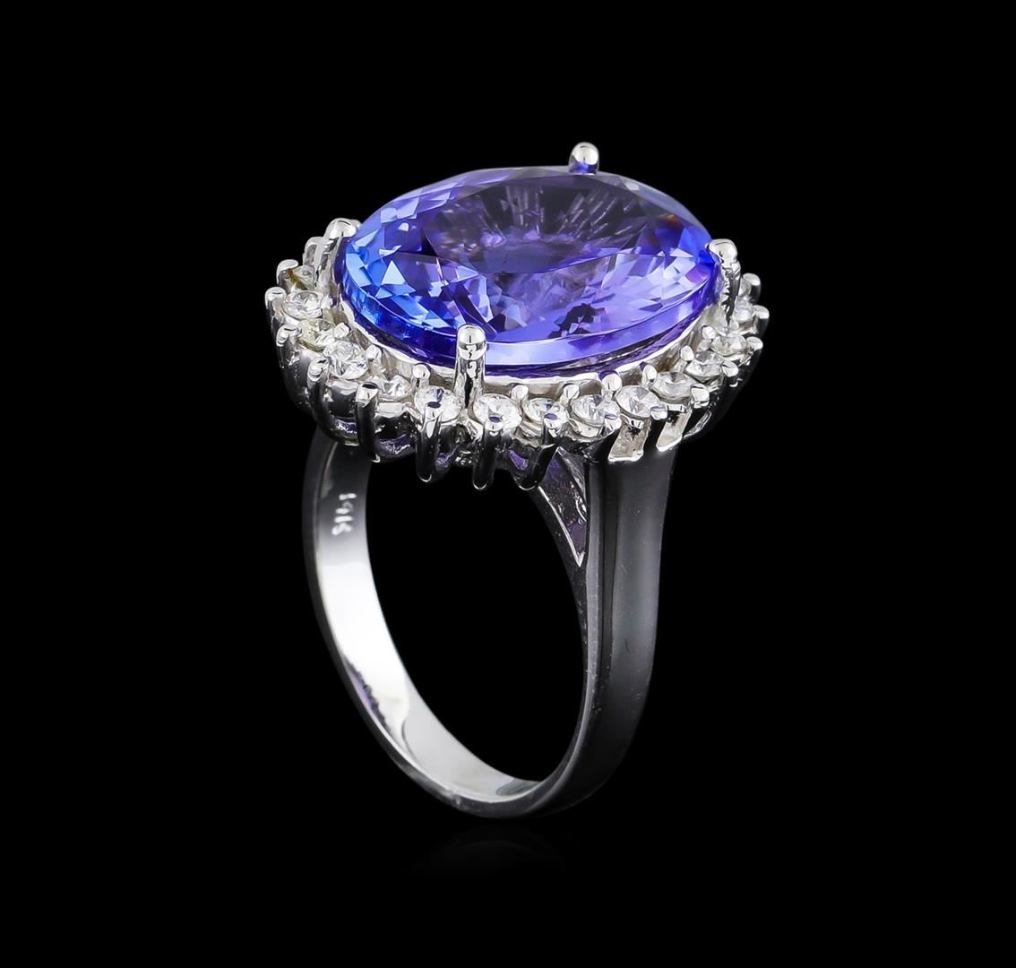 One electronically tested 14KT white gold ladies cast tanzanite and diamond ring with a bright polish finish. The featured tanzanite is set within a diamond floret supported by a ribbed under gallery, completed by a two millimeter wide band. Identified with markings of "14K". Condition is new, good workmanship. Containing: One prong set oval mixed cut natural tanzanite, measuring 15.70 x 11.90 x 6.50mm, approximate weight of 8.58ct., clarity is eye clean, type I, medium dark, very slightly grayish, bluish violet color, (GIA bV 6/3), cut is good. Transmitting light with no distortion, transparent. Colored Stone Grading Report attached. Graded in the setting. Tanzanite is a very rare gemstone that is only found in the country of Tanzania. Originally discovered in 1967. Tiffany & Company, named the stone Tanzanite. It is found in the Usumburu Mountains that border the Umba Valley of northern Tanzania. Tanzanite occurs in gray, brown, violet, blue, reddish-purple, & green. The gem is interesting because of its exceptional pleochroism. Rotated in different directions a tanzanite will exhibit multiple changes of color. Tanzanite has a low tolerance to ultrasonic cleaning, and should not be cleaned using this method. Twenty-Four prong set round brilliant cut diamonds, measuring 1.90 - 1.90 x 1.14mm (depth est.) approximate total weight of 24 Stones = 0.61ct. Graded in the setting. Clarity: SI-2 to I-2. Color: G - I. Total Weight of Colored Stones 8.58ct. Total Weight of Diamonds 0.61ct. Total Weight of Ring 8.43gm. AIG Appraised at $21,090.00.