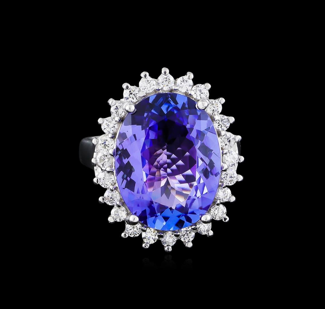 One electronically tested 14KT white gold ladies cast tanzanite and diamond ring with a bright polish finish. The featured tanzanite is set within a diamond floret supported by a ribbed under gallery, completed by a two millimeter wide band. Identified with markings of "14K". Condition is new, good workmanship. Containing: One prong set oval mixed cut natural tanzanite, measuring 15.70 x 11.90 x 6.50mm, approximate weight of 8.58ct., clarity is eye clean, type I, medium dark, very slightly grayish, bluish violet color, (GIA bV 6/3), cut is good. Transmitting light with no distortion, transparent. Colored Stone Grading Report attached. Graded in the setting. Tanzanite is a very rare gemstone that is only found in the country of Tanzania. Originally discovered in 1967. Tiffany & Company, named the stone Tanzanite. It is found in the Usumburu Mountains that border the Umba Valley of northern Tanzania. Tanzanite occurs in gray, brown, violet, blue, reddish-purple, & green. The gem is interesting because of its exceptional pleochroism. Rotated in different directions a tanzanite will exhibit multiple changes of color. Tanzanite has a low tolerance to ultrasonic cleaning, and should not be cleaned using this method. Twenty-Four prong set round brilliant cut diamonds, measuring 1.90 - 1.90 x 1.14mm (depth est.) approximate total weight of 24 Stones = 0.61ct. Graded in the setting. Clarity: SI-2 to I-2. Color: G - I. Total Weight of Colored Stones 8.58ct. Total Weight of Diamonds 0.61ct. Total Weight of Ring 8.43gm. AIG Appraised at $21,090.00.