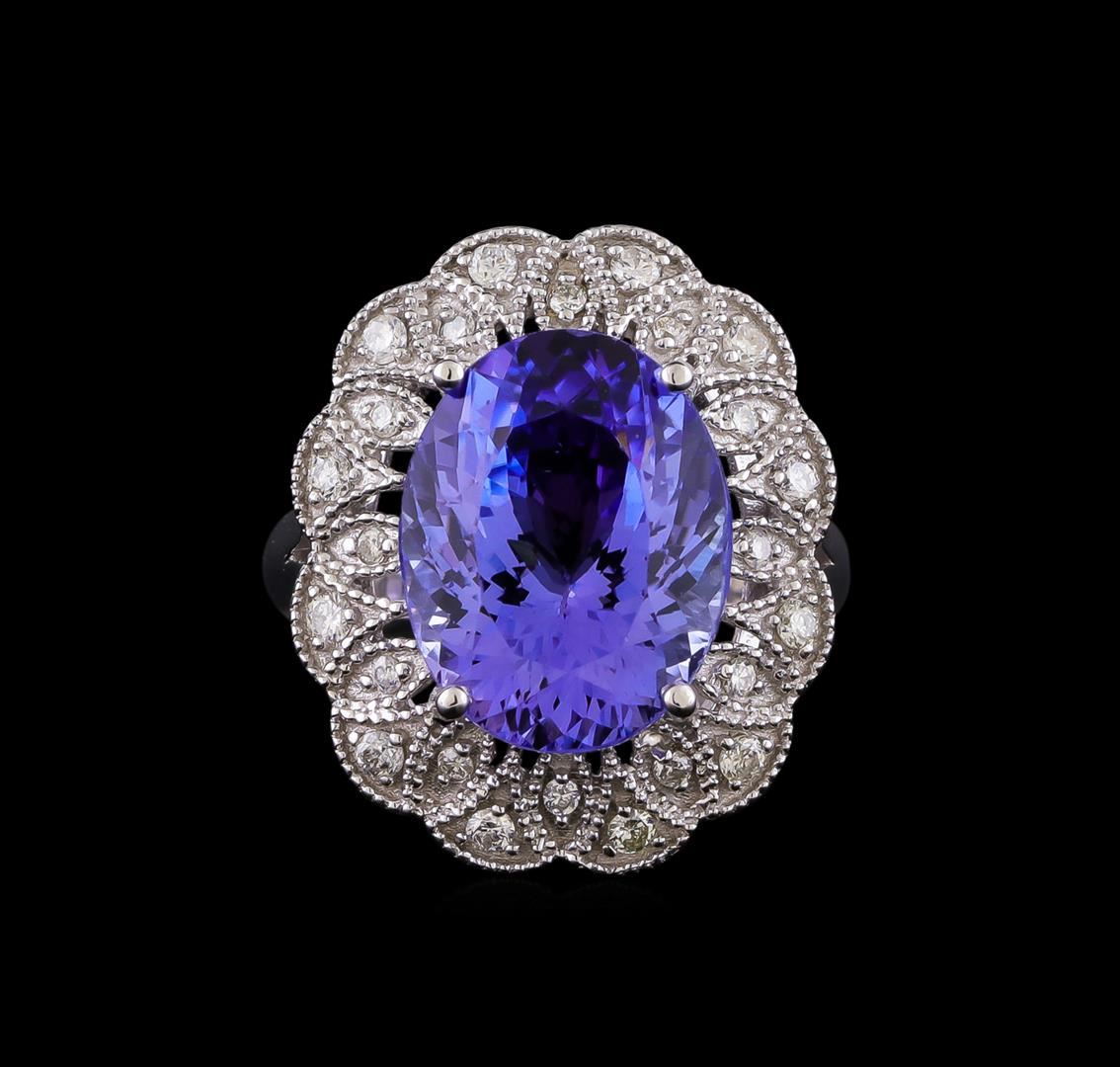 One electronically tested 14KT white gold lady's cast fashion ring with a basket halo with a bright polish with milgrain detailing finish. The featured lady's has a shank measuring 2.78 millimeters in width. Identified with markings of "K14". Condition is new, good workmanship. Containing: One prong set oval modified brilliant cut natural tanzanite, measuring 14.45 x 11.38 x 7.97mm, (depth est.) approximate weight of 8.58ct., clarity is eye clean, medium light, very slightly grayish, violetish blue color, (GIA vB 4/3), cut is good. Transmitting light with no distortion, transparent. Colored gemstones are presumed to have been subjected to commonly used enhancement processes. Graded in the setting. Twelve prong set round brilliant cut diamonds, measuring 1.80 - 1.75 x 1.11mm (depth est.) approximate total weight of 12 Stones = 0.26ct. Graded in the setting. Clarity: SI-1 to SI-2. Color: G - Good Twelve prong set round brilliant cut diamonds, measuring 1.50 - 1.40 x 0.90mm (depth est.) approximate total weight of 12 Stones = 0.14ct. Graded in the setting. Clarity: SI-1 to SI-2. Color: G - Good. Total Weight of Colored Stones 8.58ct. Total Weight of Diamonds 0.40ct. Total Weight of Ring 10.10gm. GAS Appraised.