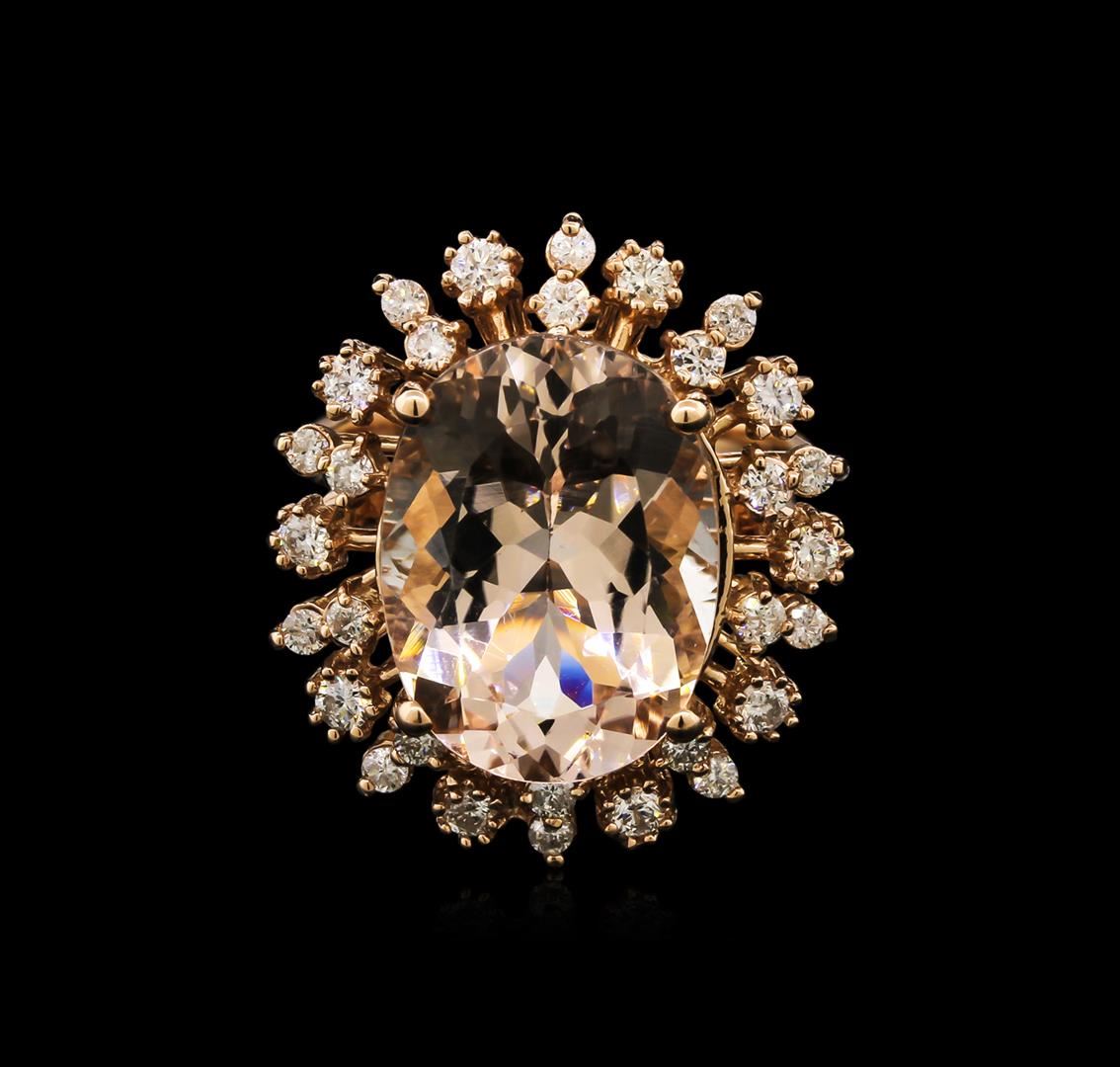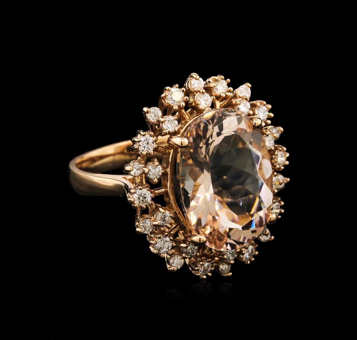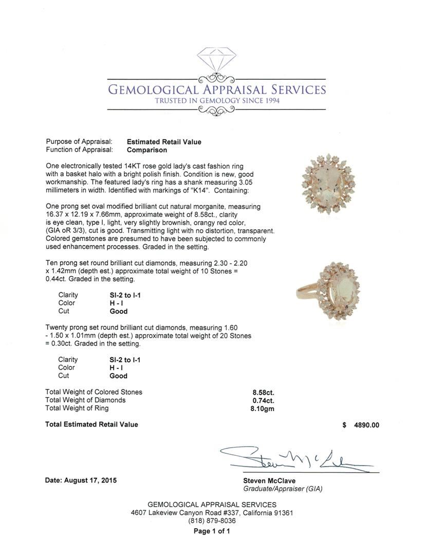 One electronically tested 14KT rose gold lady's cast fashion ring with a basket halo with a bright polish finish. The featured lady's ring has a shank measuring 3.05 millimeters in width. Identified with markings of "K14". Condition is new, good workmanship. Containing: One prong set oval modified brilliant cut natural morganite, measuring 16.37 x 12.19 x 7.66mm, approximate weight of 8.58ct., clarity is eye clean, type I, light, very slightly brownish, orangy red color, (GIA oR 3/3), cut is good. Transmitting light with no distortion, transparent. Colored gemstones are presumed to have been subjected to commonly used enhancement processes. Graded in the setting. Ten prong set round brilliant cut diamonds, measuring 2.30 - 2.20 x 1.42mm (depth est.) approximate total weight of 10 Stones = 0.44ct. Graded in the setting. Clarity: SI-2 to I-1. Color: H - I. Cut Good Twenty prong set round brilliant cut diamonds, measuring 1.60 - 1.50 x 1.01mm (depth est.) approximate total weight of 20 Stones = 0.30ct. Graded in the setting. Clarity: SI-2 to I-1. Color: H - I. Cut Good. Total Weight of Colored Stones 8.58ct. Total Weight of Diamonds 0.74ct. Total Weight of Ring 8.10gm. GAS Appraised at $4,890.00.