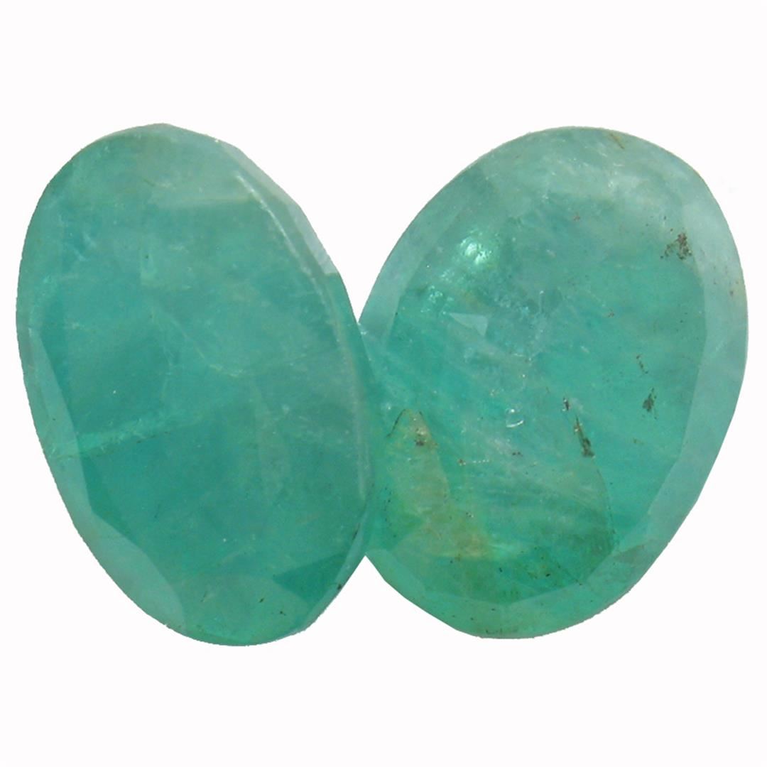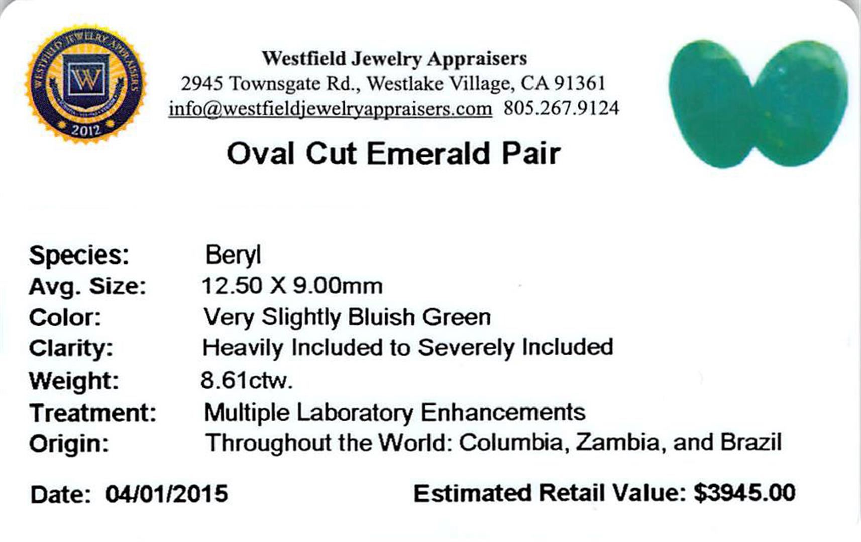 Two oval mixed cut natural emeralds exact total weight 8.61ct., clarity is heavily included, type III, medium dark, very slightly grayish, very slightly bluish green color, (GIA vslbG 6/3), cut is good. Westfield Appraised at $3,945.00.