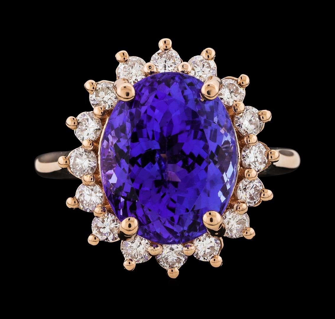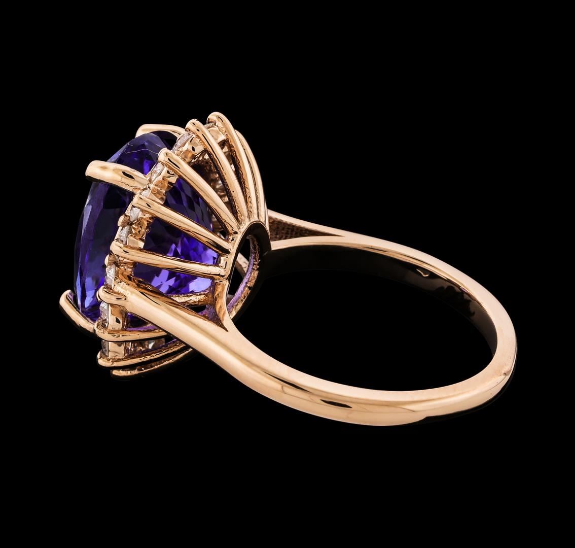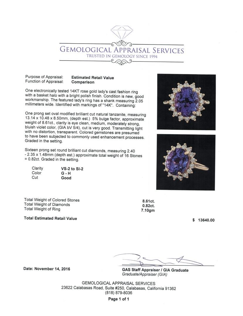 One electronically tested 14KT rose gold lady's cast fashion ring with a basket halo with a bright polish finish. The featured lady's ring has a shank measuring 2.05 millimeters wide. Identified with markings of '14K'. Condition is new, good workmanship. Containing: One prong set oval modified brilliant cut natural tanzanite, measuring 13.14 x 10.48 x 8.50mm, (depth est.) 5%. bulge factor, approximate weight of 8.61ct., clarity is eye clean, medium, moderately strong, bluish violet color, (GIA bV 5/4), cut is very good. Transmitting light with no distortion, transparent. Colored gemstones are presumed to have been subjected to commonly used enhancement processes. Graded in the setting. Sixteen prong set round brilliant cut diamonds, measuring 2.40 - 2.35 x 1.48mm (depth est.) approximate total weight of 16 Stones = 0.82ct. Graded in the setting. Clarity VS-2 to SI-2. Color: G - H Cut Good. Total Weight of Colored Stones 8.61ct.. Total Weight of Diamonds 0.82ct.. Total Weight of Ring 7.10gm GAS Appraised at $13,640.00.