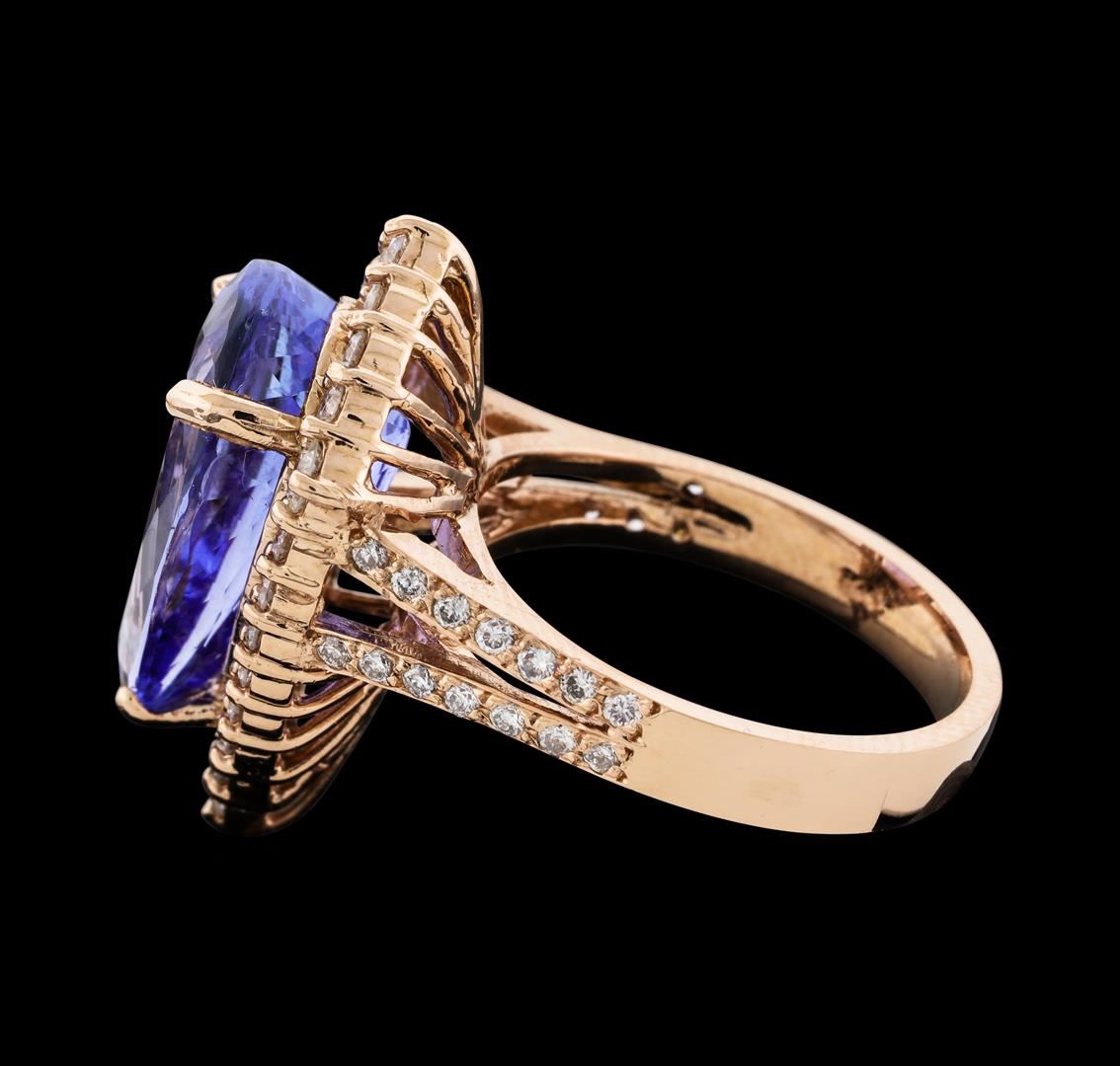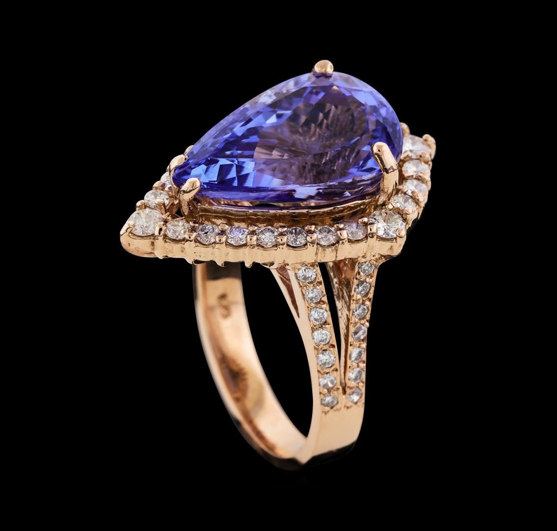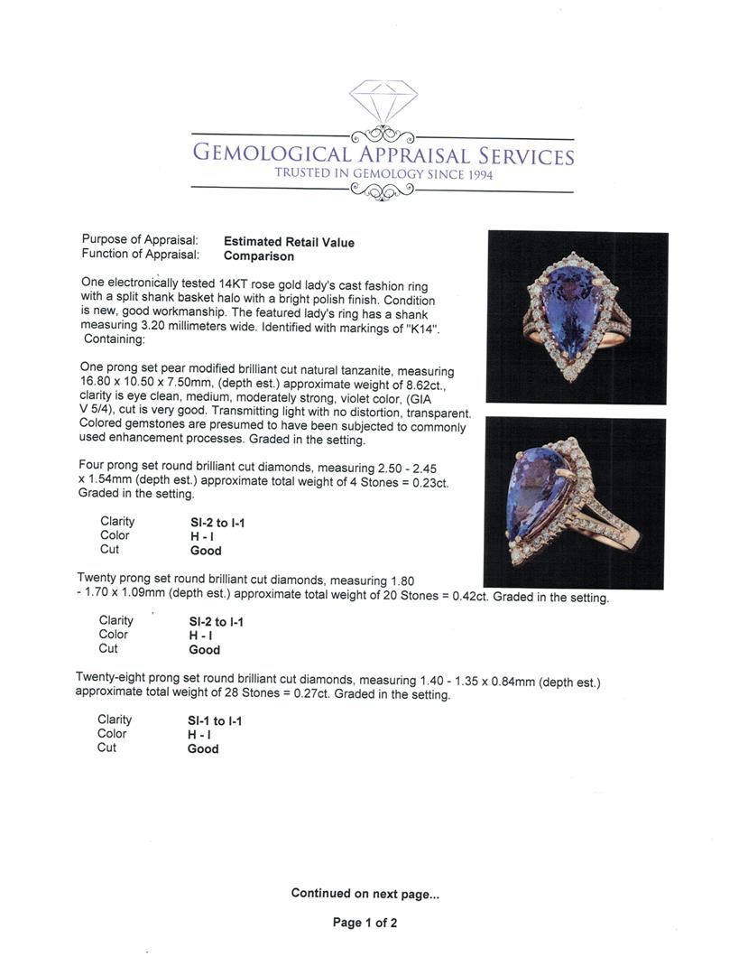 One electronically tested 14KT rose gold lady's cast fashion ring with a split shank basket halo with a bright polish finish. The featured lady's ring has a shank measuring 3.20 millimeters wide. Identified with markings of 'K14'. Condition is new, good workmanship. Containing: One prong set pear modified brilliant cut natural tanzanite, measuring 16.80 x 10.50 x 7.50mm, (depth est.) approximate weight of 8.62ct., clarity is eye clean, medium, moderately strong, violet color, (GIA V 5/4), cut is very good. Transmitting light with no distortion, transparent. Colored gemstones are presumed to have been subjected to commonly used enhancement processes. Graded in the setting. Four prong set round brilliant cut diamonds, measuring 2.50 - 2.45 x 1.54mm (depth est.) approximate total weight of 4 Stones = 0.23ct. Graded in the setting. Clarity SI-2 to I-1. Color: H - I Cut Good Twenty prong set round brilliant cut diamonds, measuring 1.80 - 1.70 x 1.09mm (depth est.) approximate total weight of 20 Stones = 0.42ct. Graded in the setting. Clarity SI-2 to I-1. Color: H - I Cut Good Twenty-Eight prong set round brilliant cut diamonds, measuring 1.40 - 1.35 x 0.84mm (depth est.) approximate total weight of 28 Stones = 0.27ct. Graded in the setting. Clarity SI-1 to I-1. Color: H - I Cut Good. Total Weight of Colored Stones 8.62ct.. Total Weight of Diamonds 0.92ct.. Total Weight of Ring 8.30gm. GAS Appraised at $13,270.00.