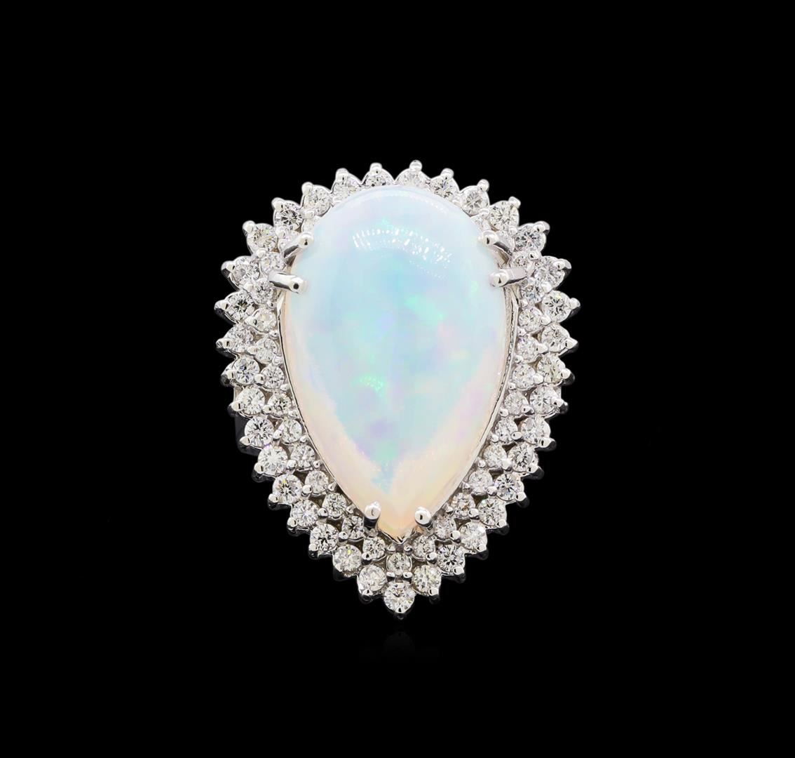 One electronically tested 14KT white gold lady's cast fashion ring with a basket double halo with a bright polish finish. The featured lady's ring has a shank measuring 3.25 millimeters in width. Identified with markings of "K14". Condition is new, good workmanship. Containing: One crystal opal that is cut in a pear shape and is prong set, measuring 21.81 mm long x 13.71 mm wide, and 6.85 mm thick and the approximate weight is 8.65 carats. The opal has a very bright, multicolor play of color (fire) in a rolling flashfire pattern; a medium dome; a good cut; no inclusions; consistent in its brightness and pattern; and is not directional. Thirty-Five prong set round brilliant cut diamonds, measuring 1.80 - 1.70 x 1.08mm (depth est.) approximate total weight of 35 Stones = 0.70ct. Graded in the setting. Clarity: VS-2 to SI-2. Color: G - Good Thirty-Four prong set round brilliant cut diamonds, measuring 1.50 - 1.40 x 0.90mm (depth est.) approximate total weight of 34 Stones = 0.42ct. Graded in the setting. Clarity: SI-1 to SI-2. Color: G - Good. Total Weight of Diamonds 1.12ct. Total Weight of Opals 8.65ct. Total Weight of Ring 12.00gm. GAS Appraised at $8,155.00.