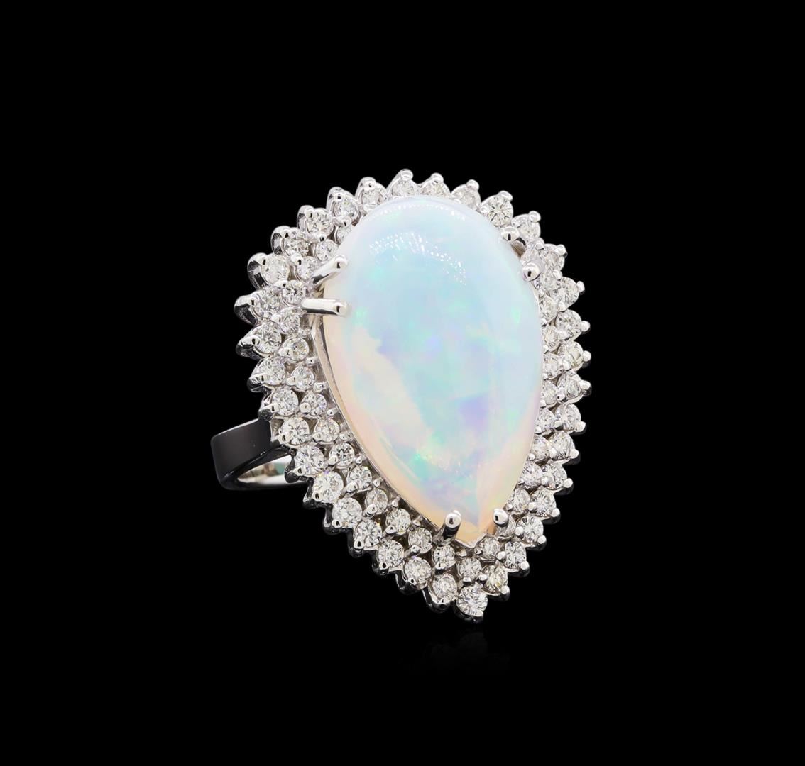 One electronically tested 14KT white gold lady's cast fashion ring with a basket double halo with a bright polish finish. The featured lady's ring has a shank measuring 3.25 millimeters in width. Identified with markings of "K14". Condition is new, good workmanship. Containing: One crystal opal that is cut in a pear shape and is prong set, measuring 21.81 mm long x 13.71 mm wide, and 6.85 mm thick and the approximate weight is 8.65 carats. The opal has a very bright, multicolor play of color (fire) in a rolling flashfire pattern; a medium dome; a good cut; no inclusions; consistent in its brightness and pattern; and is not directional. Thirty-Five prong set round brilliant cut diamonds, measuring 1.80 - 1.70 x 1.08mm (depth est.) approximate total weight of 35 Stones = 0.70ct. Graded in the setting. Clarity: VS-2 to SI-2. Color: G - Good Thirty-Four prong set round brilliant cut diamonds, measuring 1.50 - 1.40 x 0.90mm (depth est.) approximate total weight of 34 Stones = 0.42ct. Graded in the setting. Clarity: SI-1 to SI-2. Color: G - Good. Total Weight of Diamonds 1.12ct. Total Weight of Opals 8.65ct. Total Weight of Ring 12.00gm. GAS Appraised at $8,155.00.