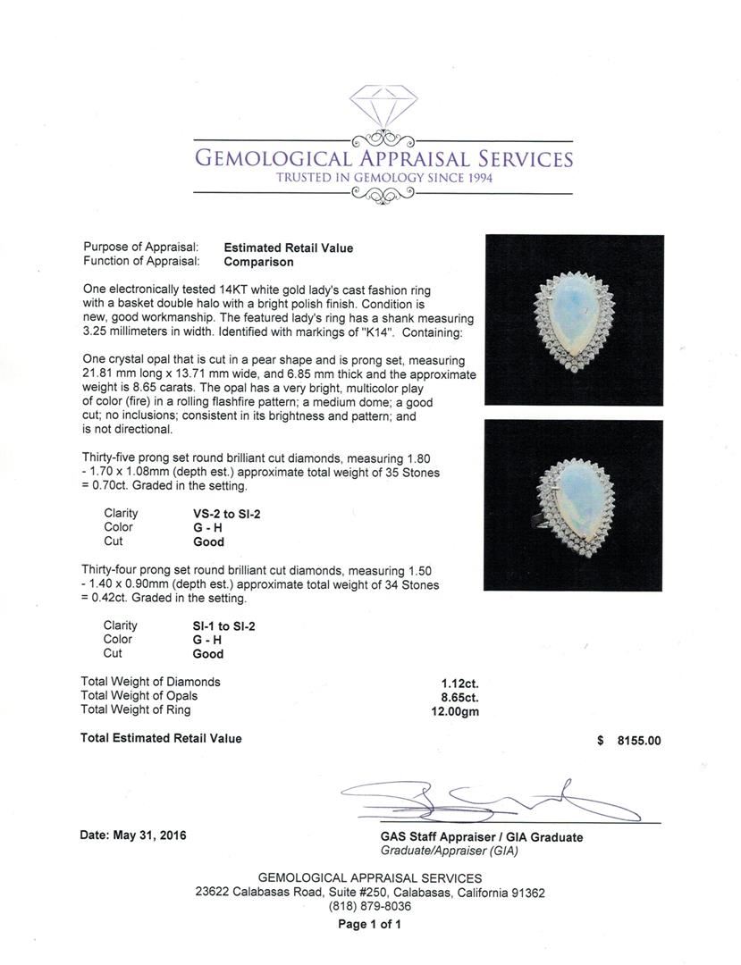 One electronically tested 14KT white gold lady's cast fashion ring with a basket double halo with a bright polish finish. The featured lady's ring has a shank measuring 3.25 millimeters in width. Identified with markings of "K14". Condition is new, good workmanship. Containing: One crystal opal that is cut in a pear shape and is prong set, measuring 21.81 mm long x 13.71 mm wide, and 6.85 mm thick and the approximate weight is 8.65 carats. The opal has a very bright, multicolor play of color (fire) in a rolling flashfire pattern; a medium dome; a good cut; no inclusions; consistent in its brightness and pattern; and is not directional. Thirty-Five prong set round brilliant cut diamonds, measuring 1.80 - 1.70 x 1.08mm (depth est.) approximate total weight of 35 Stones = 0.70ct. Graded in the setting. Clarity: VS-2 to SI-2. Color: G - Good Thirty-Four prong set round brilliant cut diamonds, measuring 1.50 - 1.40 x 0.90mm (depth est.) approximate total weight of 34 Stones = 0.42ct. Graded in the setting. Clarity: SI-1 to SI-2. Color: G - Good. Total Weight of Diamonds 1.12ct. Total Weight of Opals 8.65ct. Total Weight of Ring 12.00gm. GAS Appraised at $8,155.00.