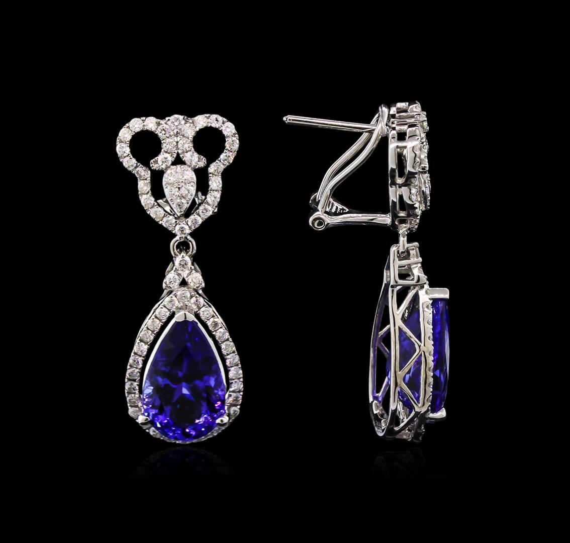 One pair of earrings featuring: 14KT white gold weighing 6.25 grams containing two tanzanites with a total weight of 8.65ct and diamonds with a total weight of 1.27ct.