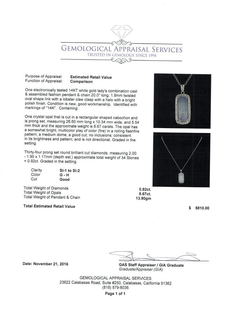 One electronically tested 14KT white gold lady's combination cast & assembled fashion pendant & chain 20.0' long, 1.9mm twisted oval shape link with a lobster claw clasp with a halo with a bright polish finish. Identified with markings of '14K'. Condition is new, good workmanship. Containing: One crystal opal that is cut in a rectangular shaped cabochon and is prong set, measuring 26.60 mm long x 10.34 mm wide, and 5.54 mm thick and the approximate weight is 8.67 carats. The opal has a somewhat bright, multicolor play of color (fire) in a rolling flashfire pattern; a medium dome; a good cut; no inclusions; consistent in its brightness and pattern; and is not directional. Graded in the setting. Thirty-Four prong set round brilliant cut diamonds, measuring 2.00 - 1.90 x 1.17mm (depth est.) approximate total weight of 34 Stones = 0.92ct. Graded in the setting. Clarity SI-1 to SI-2. Color: G - H Cut Good. Total Weight of Diamonds 0.92ct.. Total Weight of Opals 8.67ct.. Total Weight of Pendant & Chain 13.90gm. GAS Appraised at $5,810.00.