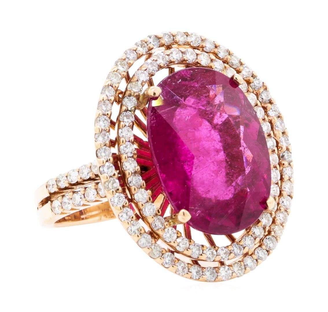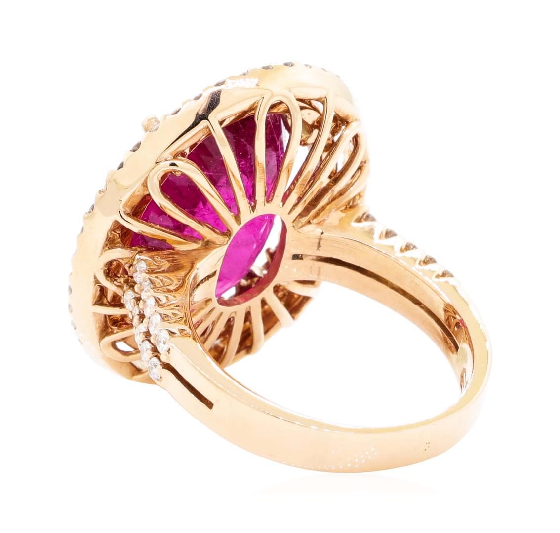 One electronically tested 14KT rose gold lady's cast fashion ring with a double basket halo with a bright polish finish. The featured lady's ring has a shank measuring 2.90 millimeters wide. Identified with markings of '14K'. Condition is new, good workmanship. Containing: One prong set oval modified mixed cut natural rubellite, measuring 14.83 x 11.13 x 6.68mm, (depth est.) 10%. bulge factor, approximate weight of 7.76ct., clarity is heavily included, medium dark, very slightly brownish, slightly purplish red color, (GIA slpR 6/3), cut is very good. Transmitting light somewhat diffusely, semi-transparent to translucent. Colored gemstones are presumed to have been subjected to commonly used enhancement processes. Graded in the setting. One Hundred prong set round brilliant cut diamonds, measuring 1.40 - 1.30 x 0.84mm (depth est.) approximate total weight of 100 Stones = 0.93ct. Graded in the setting. Color H - I Clarity SI-1 to I-1 Cut Good. Total Weight of Colored Stones 7.76ct.. Total Weight of Diamonds 0.93ct.. Total Weight of Ring 7.70gm GAS Appraised at $10655.00. GAS Appraised.