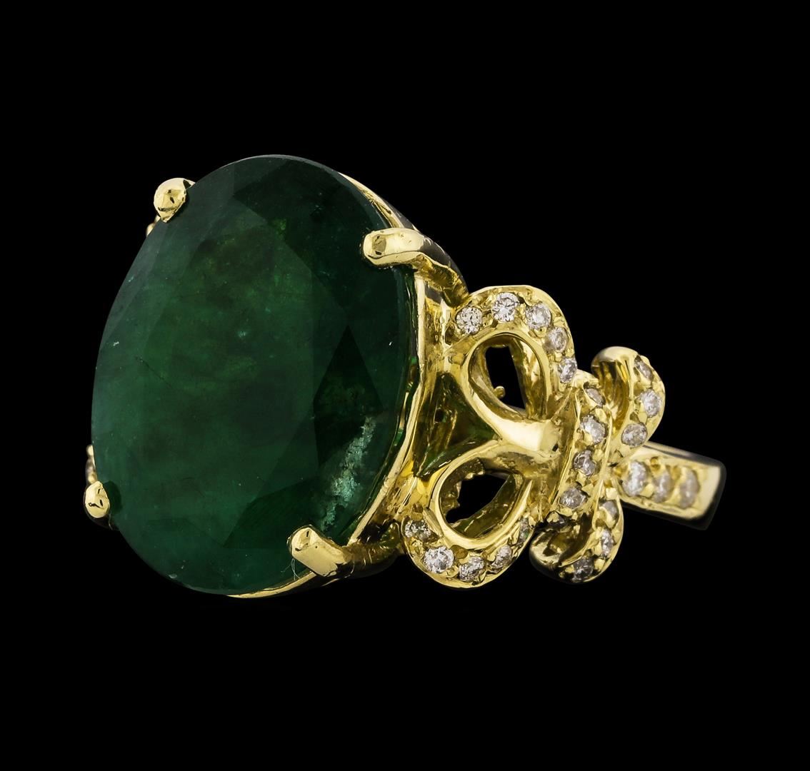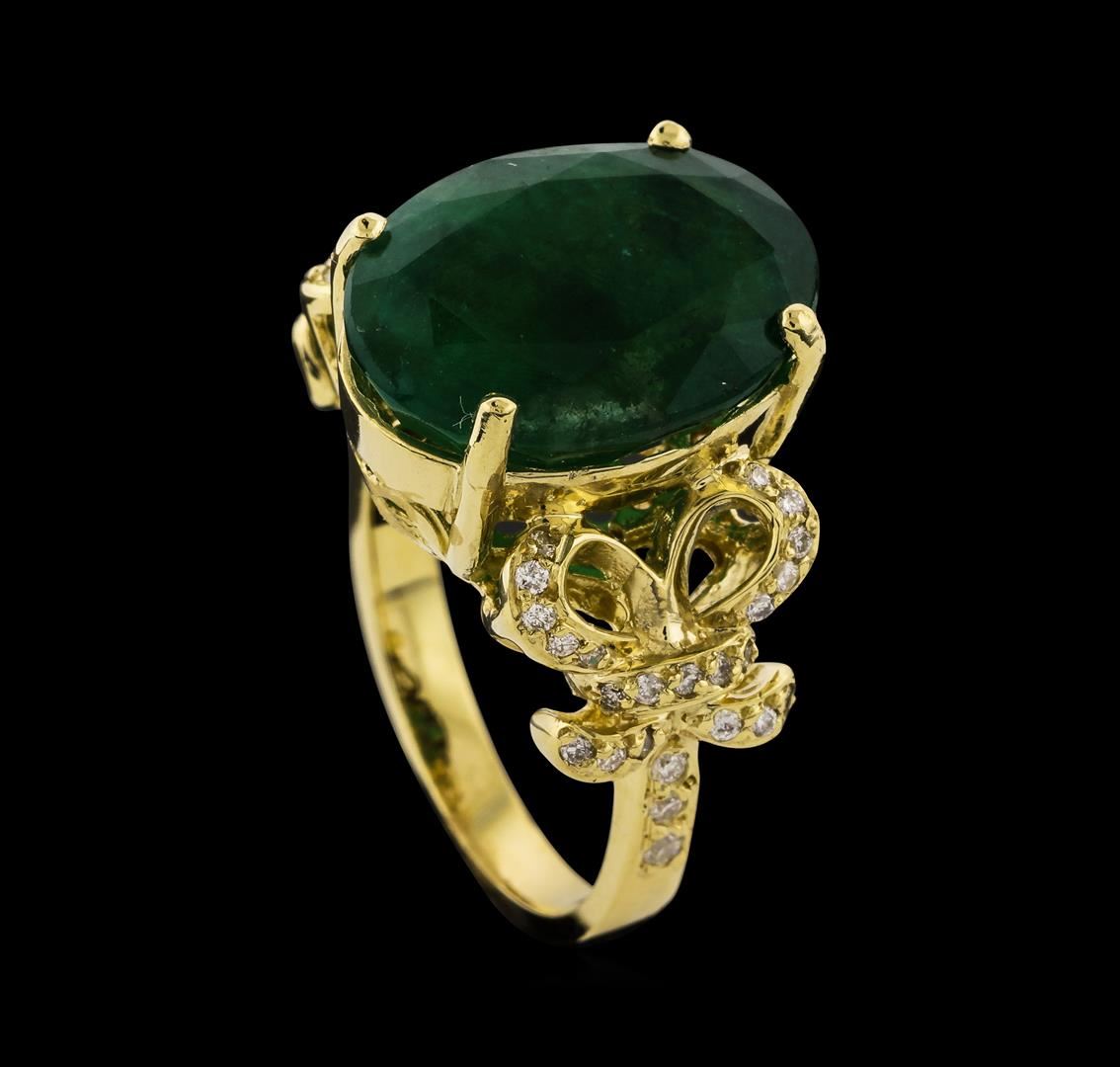 One electronically tested 14KT yellow gold lady's cast fashion ring with a cathedral shank with a bright polish finish. The featured lady's ring has diamond set bow motif shoulders and a shank measuring 2.60 millimeters wide. Identified with markings of 'K14'. Condition is new, good workmanship. Containing: One prong set oval modified mixed cut natural emerald, measuring 15.56 x 11.80 x 7.40mm, (depth est.) 13%. bulge factor, approximate weight of 8.71ct., clarity is heavily included, medium dark, moderately strong, green color, (GIA G 6/4), cut is good. Transmitting light somewhat diffusely, semi-transparent to translucent. Naturally occurring internal & external characteristics are present. Indications of oil residue. Colored gemstones are presumed to have been subjected to commonly used enhancement processes. Graded in the setting. Six prong set round brilliant cut diamonds, measuring 1.70 - 1.60 x 1.01mm (depth est.) approximate total weight of 6 Stones = 0.10ct. Graded in the setting. Clarity SI-1 to I-1. Color: H - I Cut Good Forty-Two prong set round brilliant cut diamonds, measuring 1.15 - 1.05 x 0.66mm (depth est.) approximate total weight of 42 Stones = 0.20ct. Graded in the setting. Clarity SI-1 to SI-3. Color: H - I Cut Good. Total Weight of Colored Stones 8.71ct.. Total Weight of Diamonds 0.30ct.. Total Weight of Ring 8.60gm. GAS Appraised at $9,775.00.