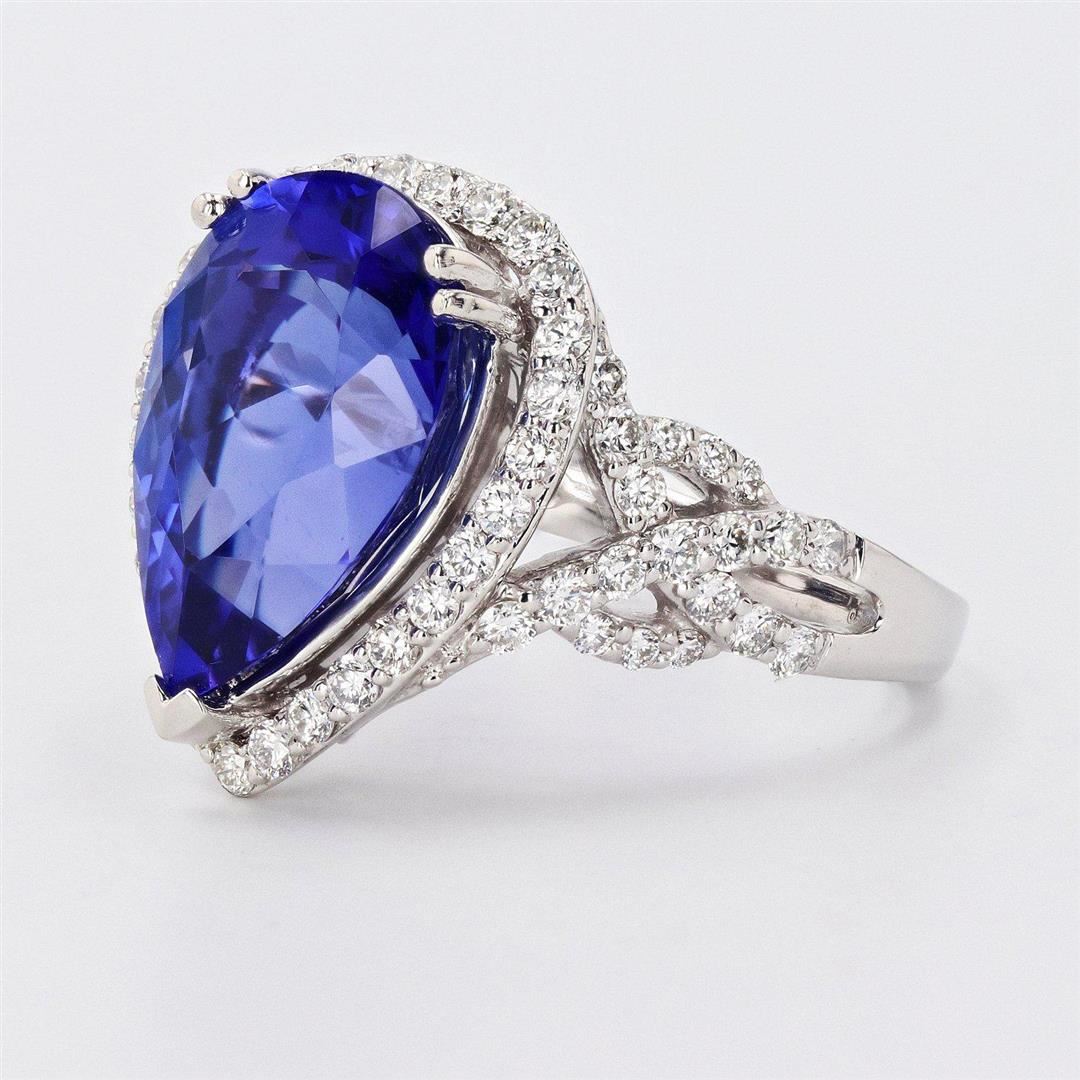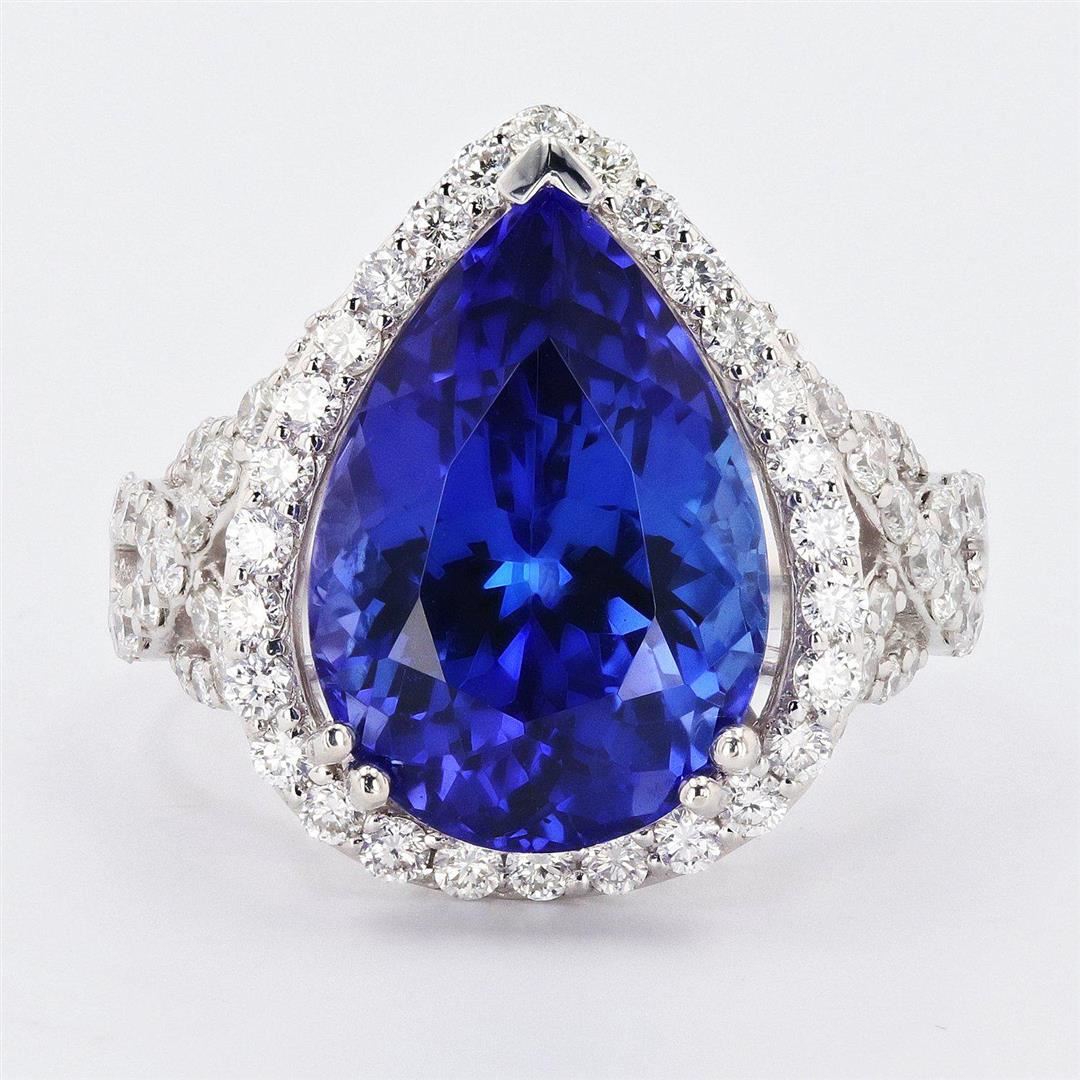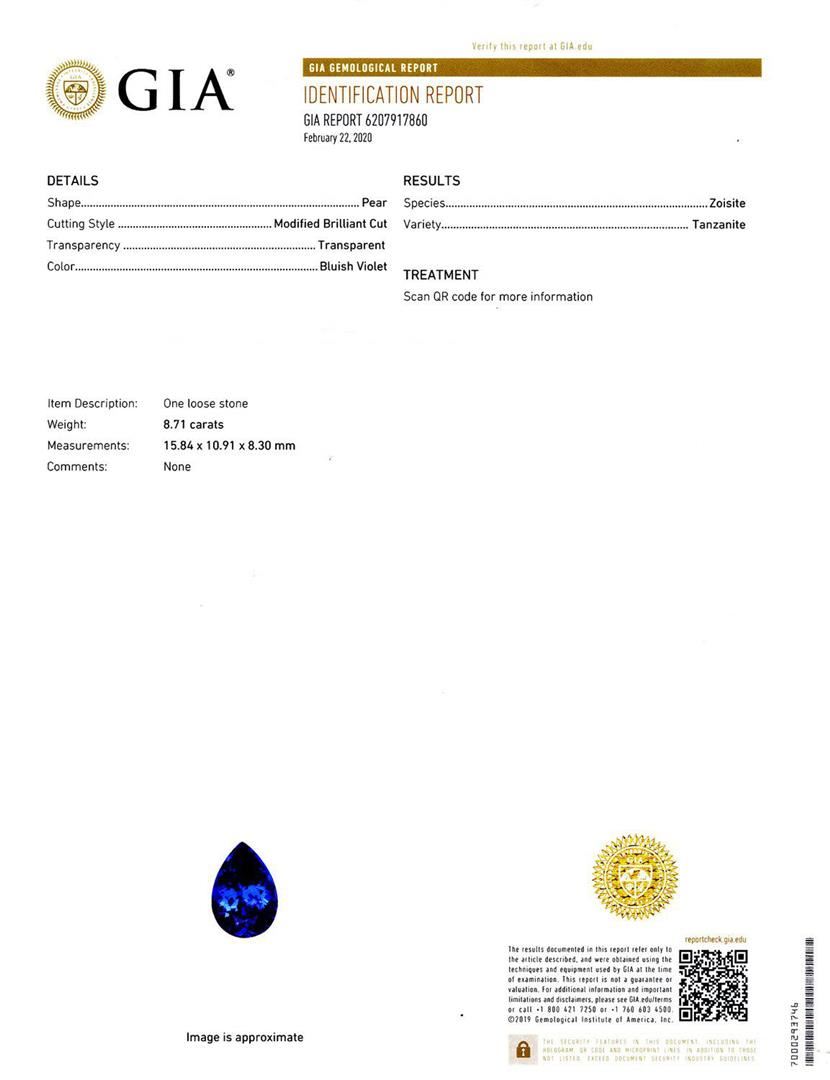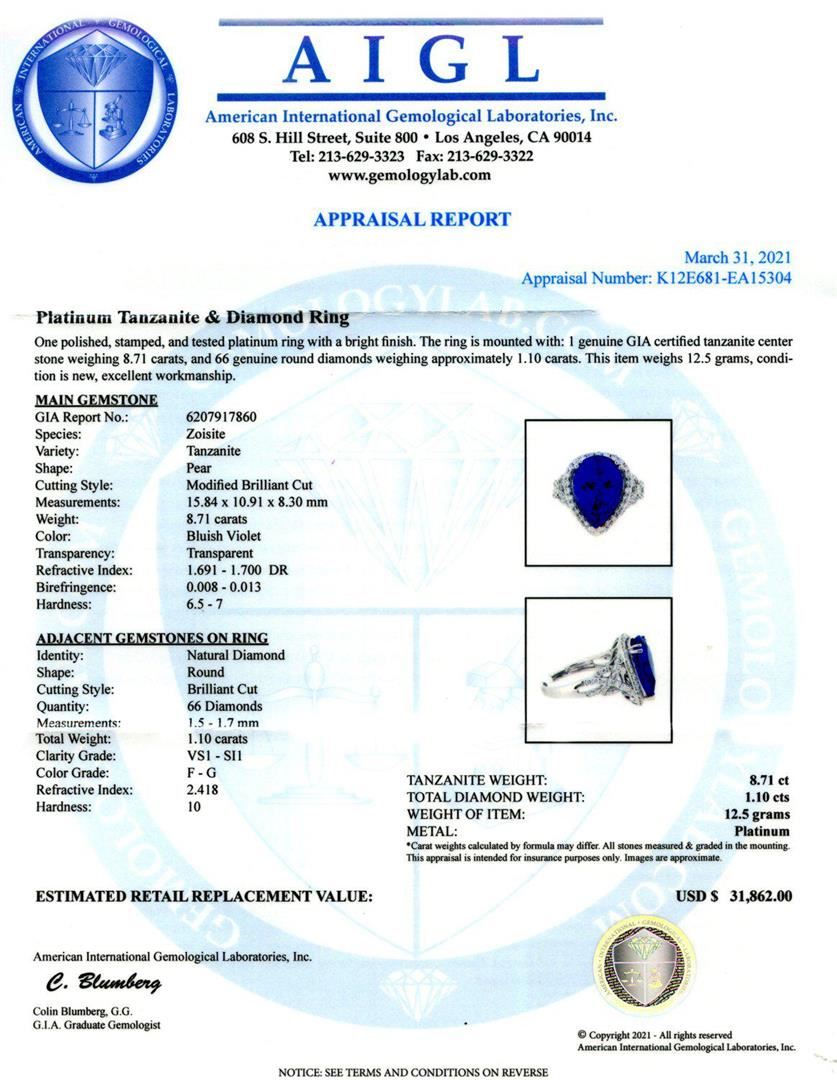 One polished, stamped, and tested platinum ring with a bright finish. The ring is mounted with: 1 genuine GIA certified tanzanite center stone weighing 8.71 carats, and 66 genuine round diamonds weighing approximately 1.10 carats. This item weighs 12.5 grams, condi-tion is new, excellent workmanship. MAIN GEMSTONE GIA Report No.: 6207917860 Species: Zoisite Variety: Tanzanite Shape: Pear Cutting Style: Modified Brilliant Cut Measurements: 15.84 x 10.91 x 8.30mm Weight: 8.71 carats Color: Bluish Violet Transparency: Transparent Refractive Index: 1.691 - 1.700 DR Birefringence: 0.008 - 0.013 Hardness: 6.5 - 7 ADJACENT GEMSTONES ON RING Identity: Natural Diamond Shape: Round Cutting Style: Brilliant Cut Quantity: 66 Diamonds Measurements: 1.5 - 1 .7mm Total Weight: 1.10 carats Clarity Grade: VS1 to SI1 Color Grade: F - G Refractive Index: 2.418 Hardness: 10 TANZANITE WEIGHT: 8.71ct TOTAL DIAMOND WEIGHT: 1.10ctw WEIGHT OF ITEM: 12.5 grams METAL: Platinum