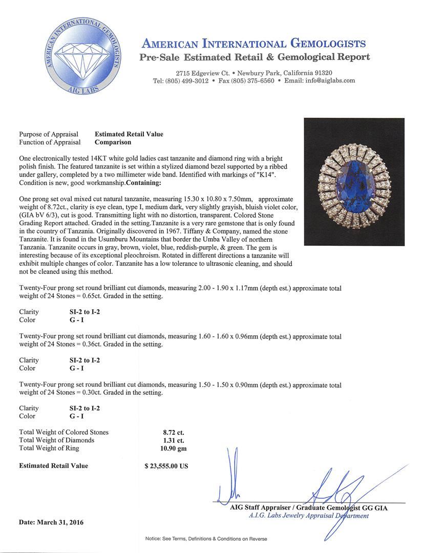 One electronically tested 14KT white gold ladies cast tanzanite and diamond ring with a bright polish finish. The featured tanzanite is set within a stylized diamond bezel supported by a ribbed under gallery, completed by a two millimeter wide band. Identified with markings of "K14". Condition is new, good workmanship. Containing: One prong set oval mixed cut natural tanzanite, measuring 15.30 x 10.80 x 7.50mm, approximate weight of 8.72ct., clarity is eye clean, type I, medium dark, very slightly grayish, bluish violet color, (GIA bV 6/3), cut is good. Transmitting light with no distortion, transparent. Colored Stone Grading Report attached. Graded in the setting. Tanzanite is a very rare gemstone that is only found in the country of Tanzania. Originally discovered in 1967. Tiffany & Company, named the stone Tanzanite. It is found in the Usumburu Mountains that border the Umba Valley of northern Tanzania. Tanzanite occurs in gray, brown, violet, blue, reddish-purple, & green. The gem is interesting because of its exceptional pleochroism. Rotated in different directions a tanzanite will exhibit multiple changes of color. Tanzanite has a low tolerance to ultrasonic cleaning, and should not be cleaned using this method. Twenty-Four prong set round brilliant cut diamonds, measuring 2.00 - 1.90 x 1.17mm (depth est.) approximate total weight of 24 Stones = 0.65ct. Graded in the setting. Clarity: SI-2 to I-2. Color: G - I Twenty-Four prong set round brilliant cut diamonds, measuring 1.60 - 1.60 x 0.96mm (depth est.) approximate total weight of 24 Stones = 0.36ct. Graded in the setting. Clarity: SI-2 to I-2. Color: G - I Twenty-Four prong set round brilliant cut diamonds, measuring 1.50 - 1.50 x 0.90mm (depth est.) approximate total weight of 24 Stones = 0.30ct. Graded in the setting. Clarity: SI-2 to I-2. Color: G - I. Total Weight of Colored Stones 8.72ct. Total Weight of Diamonds 1.31ct. Total Weight of Ring 10.90gm. AIG Appraised at $23,555.00.