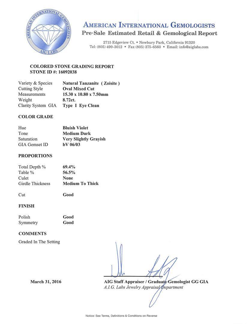 One electronically tested 14KT white gold ladies cast tanzanite and diamond ring with a bright polish finish. The featured tanzanite is set within a stylized diamond bezel supported by a ribbed under gallery, completed by a two millimeter wide band. Identified with markings of "K14". Condition is new, good workmanship. Containing: One prong set oval mixed cut natural tanzanite, measuring 15.30 x 10.80 x 7.50mm, approximate weight of 8.72ct., clarity is eye clean, type I, medium dark, very slightly grayish, bluish violet color, (GIA bV 6/3), cut is good. Transmitting light with no distortion, transparent. Colored Stone Grading Report attached. Graded in the setting. Tanzanite is a very rare gemstone that is only found in the country of Tanzania. Originally discovered in 1967. Tiffany & Company, named the stone Tanzanite. It is found in the Usumburu Mountains that border the Umba Valley of northern Tanzania. Tanzanite occurs in gray, brown, violet, blue, reddish-purple, & green. The gem is interesting because of its exceptional pleochroism. Rotated in different directions a tanzanite will exhibit multiple changes of color. Tanzanite has a low tolerance to ultrasonic cleaning, and should not be cleaned using this method. Twenty-Four prong set round brilliant cut diamonds, measuring 2.00 - 1.90 x 1.17mm (depth est.) approximate total weight of 24 Stones = 0.65ct. Graded in the setting. Clarity: SI-2 to I-2. Color: G - I Twenty-Four prong set round brilliant cut diamonds, measuring 1.60 - 1.60 x 0.96mm (depth est.) approximate total weight of 24 Stones = 0.36ct. Graded in the setting. Clarity: SI-2 to I-2. Color: G - I Twenty-Four prong set round brilliant cut diamonds, measuring 1.50 - 1.50 x 0.90mm (depth est.) approximate total weight of 24 Stones = 0.30 ct. Graded in the setting. Clarity: SI-2 to I-2. Color: G - I. Total Weight of Colored Stones 8.72ct. Total Weight of Diamonds 1.31ct. Total Weight of Ring 10.90gm. AIG Appraised.
