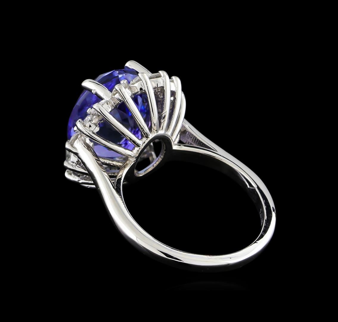One electronically tested 14KT white gold ladies cast tanzanite and diamond ring with a bright polish finish. The featured tanzanite is set within a diamond floret supported by a ribbed under gallery, completed by a two millimeter wide band. Identified with markings of "14K". Condition is new, good workmanship. Containing: One prong set oval mixed cut natural tanzanite, measuring 13.10 x 10.50 x 9.00mm, approximate weight of 8.72ct., clarity is eye clean, type I, medium dark, very slightly grayish, bluish violet color, (GIA bV 6/3), cut is good. Transmitting light with no distortion, transparent. Colored Stone Grading Report attached. Graded in the setting. Tanzanite is a very rare gemstone that is only found in the country of Tanzania. Originally discovered in 1967. Tiffany & Company, named the stone Tanzanite. It is found in the Usumburu Mountains that border the Umba Valley of northern Tanzania. Tanzanite occurs in gray, brown, violet, blue, reddish-purple, & green. The gem is interesting because of its exceptional pleochroism. Rotated in different directions a tanzanite will exhibit multiple changes of color. Tanzanite has a low tolerance to ultrasonic cleaning, and should not be cleaned using this method. Sixteen prong set round brilliant cut diamonds, measuring 2.30 - 2.30 x 1.38mm (depth est.) approximate total weight of 16 Stones = 0.72ct. Graded in the setting. Clarity: SI-2 to I-2. Color: G - I. Total Weight of Colored Stones 8.72ct. Total Weight of Diamonds 0.72ct. Total Weight of Ring 7.13gm. AIG Appraised at $21,450.00.