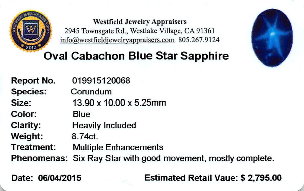 One oval cabochon cut natural blue star sapphire, measuring 13.90 x 10.00 x 5.25mm, exact weight 8.74ct., clarity is heavily included, dark, very slightly grayish, blue color, (GIA B 7/3), cut is good. This stone has a mostly complete six ray star with medium intensity and good movement Transmitting light somewhat diffusely, translucent to opaque. Naturally occurring internal & external characteristics are present. Indications of multiple laboratory enhancements, including high temperature heat treatment Westfield Appraised at $2,795.00.