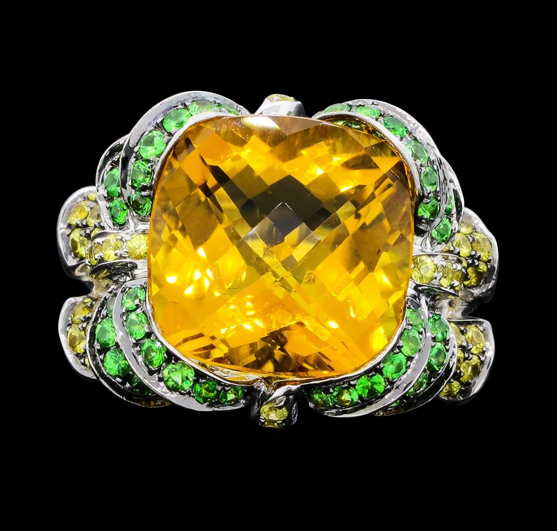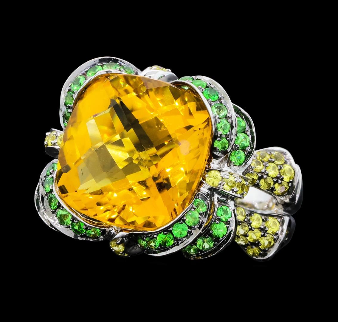 One lady's ring featuring: 18KT white gold weighing 10.1 grams containing one citrine quartz weighing 8.75ct, tsavorite garnets weighing 0.60ctw and lemon quartz weighing 0.75ctw.