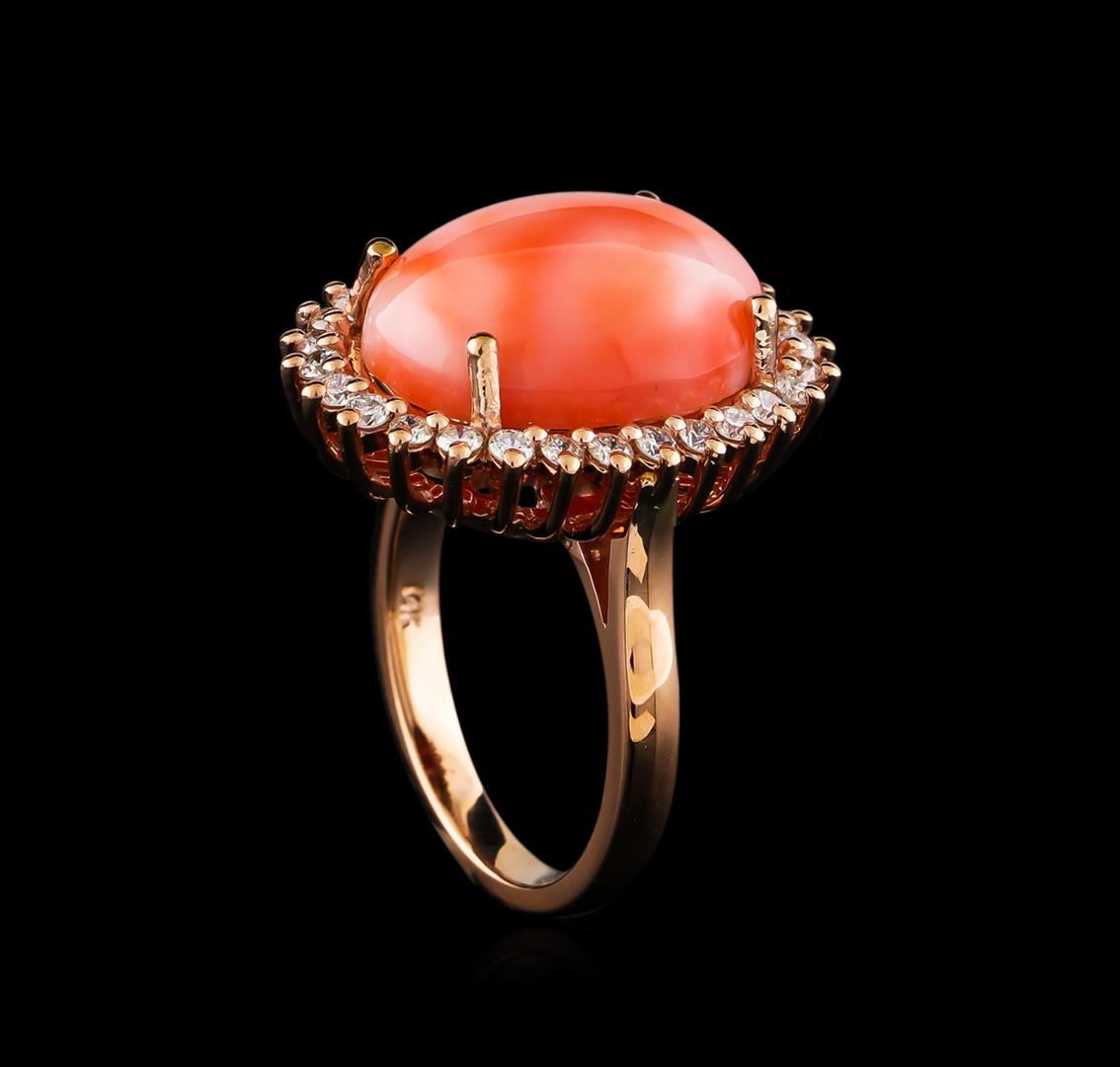 One ring featuring: 14KT rose gold weighing 6.65 grams containing one coral with a total weight of 8.75 and side diamonds with a total weight of 0.58ct.