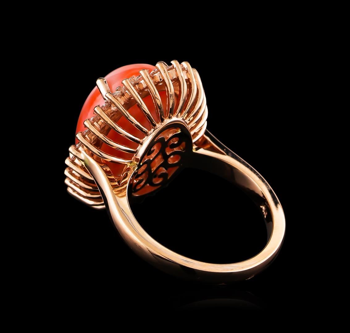 One ring featuring: 14KT rose gold weighing 6.65 grams containing one coral with a total weight of 8.75 and side diamonds with a total weight of 0.58ct.