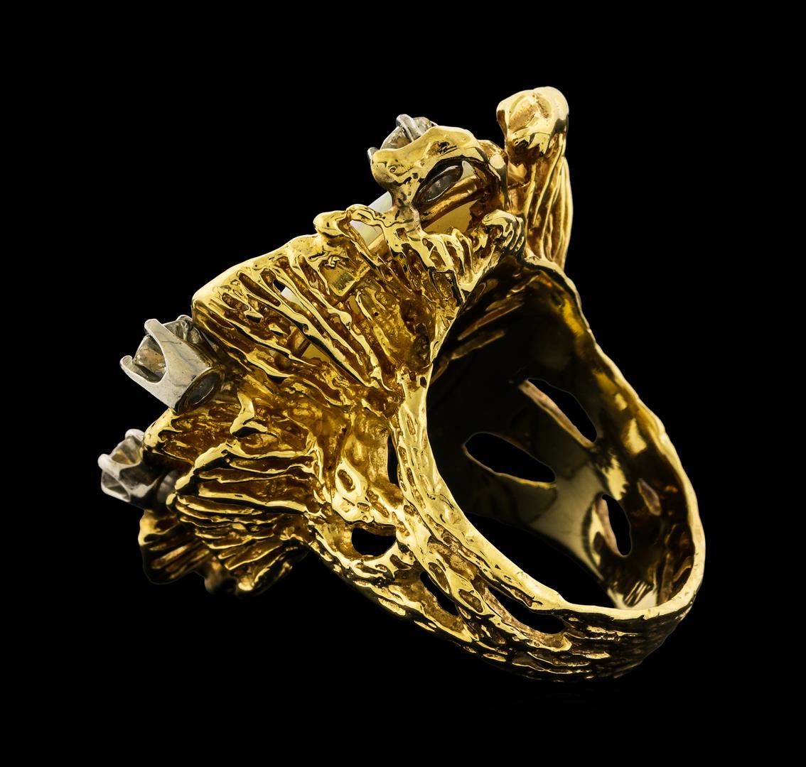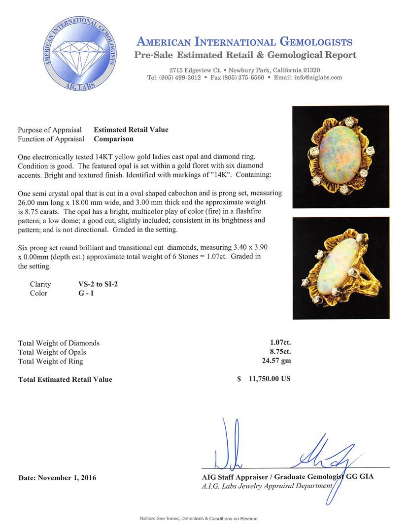 One electronically tested 14KT yellow gold ladies cast opal and diamond ring. The featured opal is set within a gold floret with six diamond accents. Bright and textured finish. Identified with markings of '14K'. Condition is good. Containing: One semi crystal opal that is cut in a oval shaped cabochon and is prong set, measuring 26.00 mm long x 18.00 mm wide, and 3.00 mm thick and the approximate weight is 8.75 carats. The opal has a bright, multicolor play of color (fire) in a flashfire pattern; a low dome; a good cut; slightly included; consistent in its brightness and pattern; and is not directional. Graded in the setting. Six prong set round brilliant and transitional cut diamonds, measuring 3.40 x 3.90 x 0.00mm (depth est.) approximate total weight of 6 Stones = 1.07ct. Graded in the setting. Clarity VS-2 to SI-2. Color: G - I. Total Weight of Diamonds 1.07ct.. Total Weight of Opals 8.75ct.. Total Weight of Ring 24.57gm. AIG Appraised at $11,750.00.