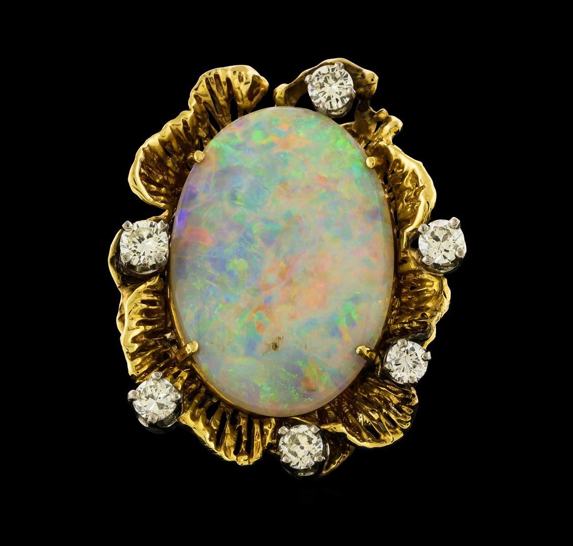 One electronically tested 14KT yellow gold ladies cast opal and diamond ring. The featured opal is set within a gold floret with six diamond accents. Bright and textured finish. Identified with markings of '14K'. Condition is good. Containing: One semi crystal opal that is cut in a oval shaped cabochon and is prong set, measuring 26.00 mm long x 18.00 mm wide, and 3.00 mm thick and the approximate weight is 8.75 carats. The opal has a bright, multicolor play of color (fire) in a flashfire pattern; a low dome; a good cut; slightly included; consistent in its brightness and pattern; and is not directional. Graded in the setting. Six prong set round brilliant and transitional cut diamonds, measuring 3.40 x 3.90 x 0.00mm (depth est.) approximate total weight of 6 Stones = 1.07ct. Graded in the setting. Clarity VS-2 to SI-2. Color: G - I. Total Weight of Diamonds 1.07ct.. Total Weight of Opals 8.75ct.. Total Weight of Ring 24.57gm. AIG Appraised at $11,750.00.