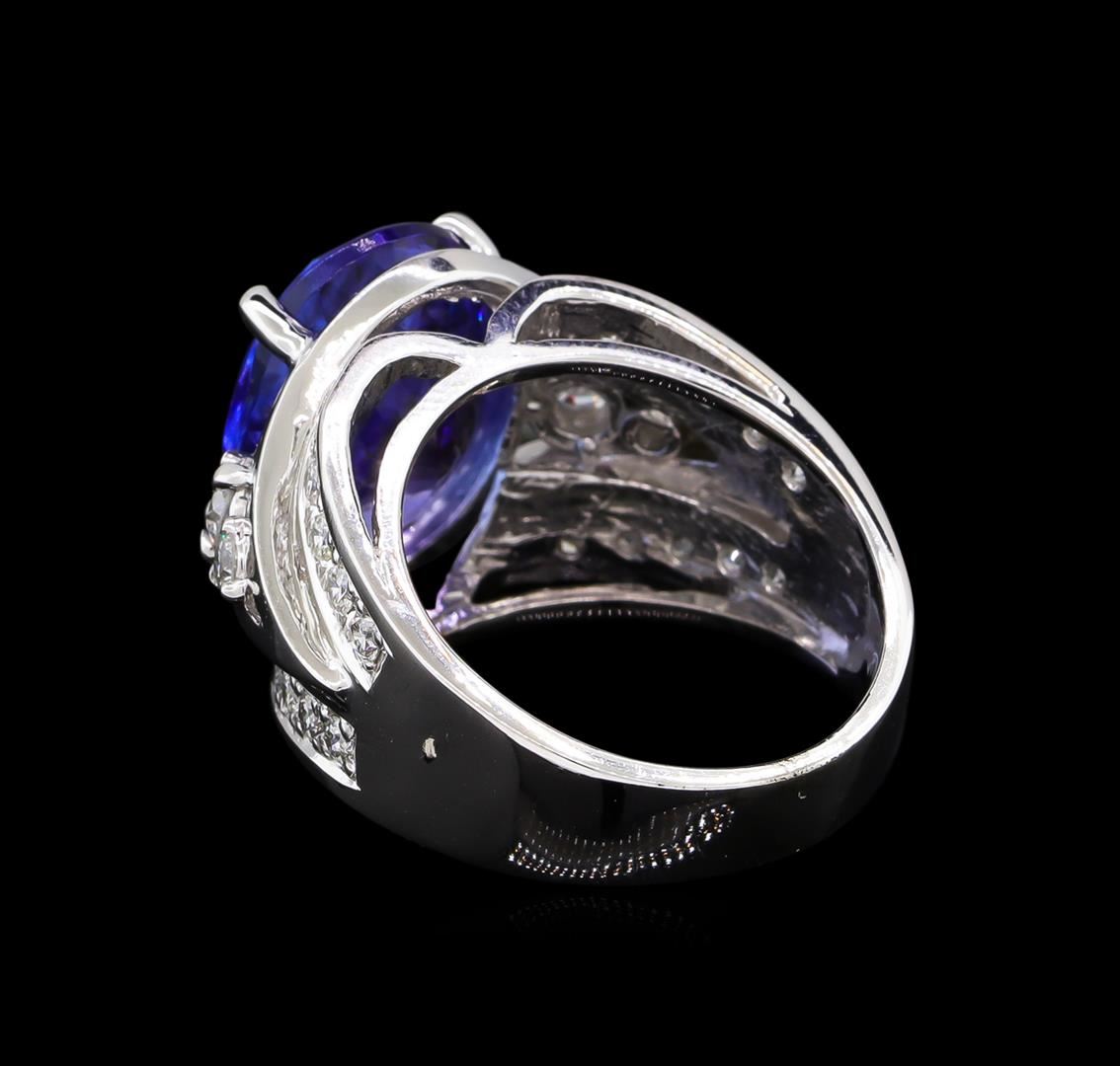 One electronically tested 14KT white gold lady's cast fashion ring with a tapered cathedral shank with a bright polish finish. The featured lady's ring has a shank measuring 4.49 millimeters wide. Condition is new, good workmanship. Containing: One prong set oval modified brilliant cut natural tanzanite, measuring 14.61 x 10.84 x 7.20mm, 8%. bulge factor, approximate weight of 8.75ct., clarity is eye clean, type I, medium, moderately strong, bluish violet color, (GIA bV 5/4), cut is excellent. Transmitting light with no distortion, transparent. Colored gemstones are presumed to have been subjected to commonly used enhancement processes. Graded in the setting. Two prong set round brilliant cut diamonds, measuring 3.20 - 3.10 x 1.95mm (depth est.) approximate total weight of 2 Stones = 0.24ct. Graded in the setting. Clarity: SI-2 to I-1. Color: H - I. Cut Good Two prong set round brilliant cut diamonds, measuring 2.40 - 2.30 x 1.46mm (depth est.) approximate total weight of 2 Stones = 0.10ct. Graded in the setting. Clarity: VS-2 to SI-1. Color: G - H. Cut Very Good Twenty prong set round brilliant cut diamonds, measuring 1.90 - 1.80 x 1.17mm (depth est.) approximate total weight of 20 Stones = 0.50ct. Graded in the setting. Clarity: VS-2 to SI-2. Color: H - I. Cut Good. Total Weight of Colored Stones 8.75ct. Total Weight of Diamonds 0.84ct. Total Weight of Ring 11.30gm. GAS Appraised at $14,960.00.