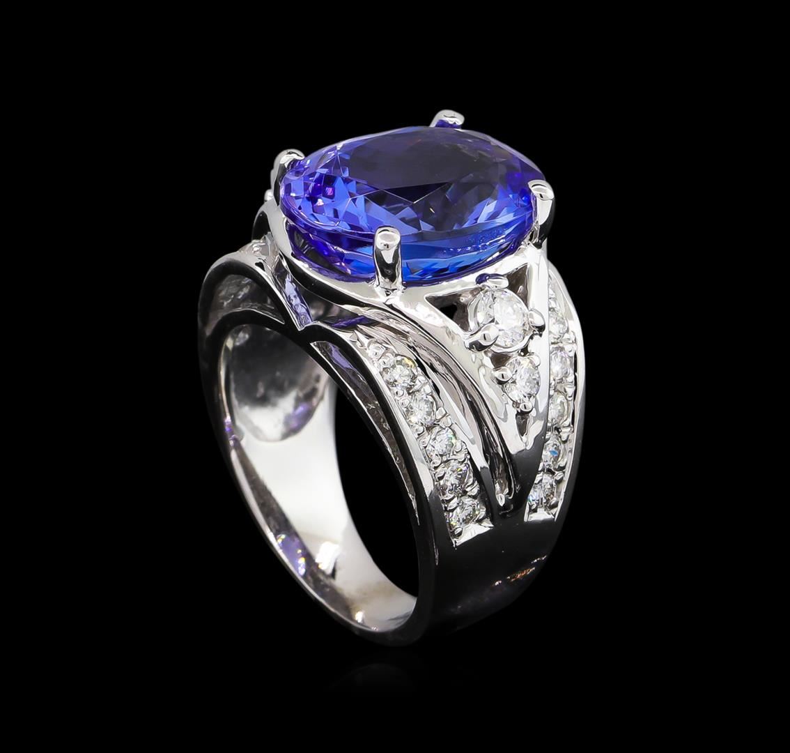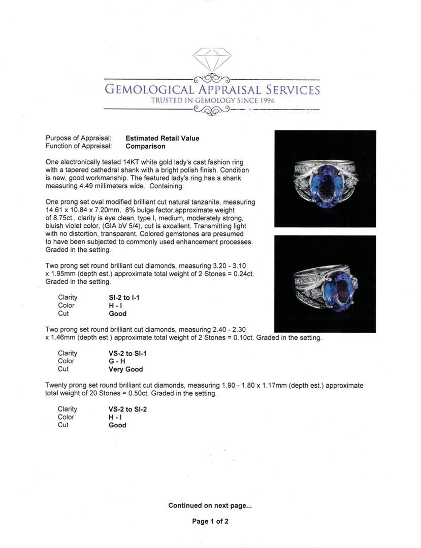 One electronically tested 14KT white gold lady's cast fashion ring with a tapered cathedral shank with a bright polish finish. The featured lady's ring has a shank measuring 4.49 millimeters wide. Condition is new, good workmanship. Containing: One prong set oval modified brilliant cut natural tanzanite, measuring 14.61 x 10.84 x 7.20mm, 8%. bulge factor, approximate weight of 8.75ct., clarity is eye clean, type I, medium, moderately strong, bluish violet color, (GIA bV 5/4), cut is excellent. Transmitting light with no distortion, transparent. Colored gemstones are presumed to have been subjected to commonly used enhancement processes. Graded in the setting. Two prong set round brilliant cut diamonds, measuring 3.20 - 3.10 x 1.95mm (depth est.) approximate total weight of 2 Stones = 0.24ct. Graded in the setting. Clarity: SI-2 to I-1. Color: H - I. Cut Good Two prong set round brilliant cut diamonds, measuring 2.40 - 2.30 x 1.46mm (depth est.) approximate total weight of 2 Stones = 0.10ct. Graded in the setting. Clarity: VS-2 to SI-1. Color: G - H. Cut Very Good Twenty prong set round brilliant cut diamonds, measuring 1.90 - 1.80 x 1.17mm (depth est.) approximate total weight of 20 Stones = 0.50ct. Graded in the setting. Clarity: VS-2 to SI-2. Color: H - I. Cut Good. Total Weight of Colored Stones 8.75ct. Total Weight of Diamonds 0.84ct. Total Weight of Ring 11.30gm. GAS Appraised at $14,960.00.
