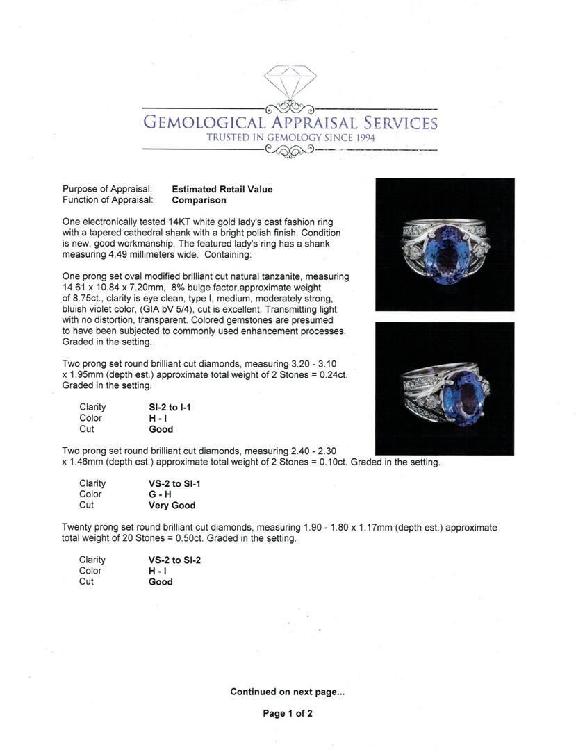 One electronically tested 14KT white gold lady's cast fashion ring with a tapered cathedral shank with a bright polish finish. The featured lady's ring has a shank measuring 4.49 millimeters wide. Condition is new, good workmanship. Containing: One prong set oval modified brilliant cut natural tanzanite, measuring 14.61 x 10.84 x 7.20mm, 8%. bulge factor, approximate weight of 8.75ct., clarity is eye clean, type I, medium, moderately strong, bluish violet color, (GIA bV 5/4), cut is excellent. Transmitting light with no distortion, transparent. Colored gemstones are presumed to have been subjected to commonly used enhancement processes. Graded in the setting. Two prong set round brilliant cut diamonds, measuring 3.20 - 3.10 x 1.95mm (depth est.) approximate total weight of 2 Stones = 0.24ct. Graded in the setting. Clarity: SI-2 to I-1. Color: H - I. Cut Good Two prong set round brilliant cut diamonds, measuring 2.40 - 2.30 x 1.46mm (depth est.) approximate total weight of 2 Stones = 0.10 ct. Graded in the setting. Clarity: VS-2 to SI-1. Color: G - H. Cut Very Good Twenty prong set round brilliant cut diamonds, measuring 1.90 - 1.80 x 1.17mm (depth est.) approximate total weight of 20 Stones = 0.50 ct. Graded in the setting. Clarity: VS-2 to SI-2. Color: H - I. Cut Good. Total Weight of Colored Stones 8.75ct. Total Weight of Diamonds 0.84ct. Total Weight of Ring 11.30gm. GAS Appraised.