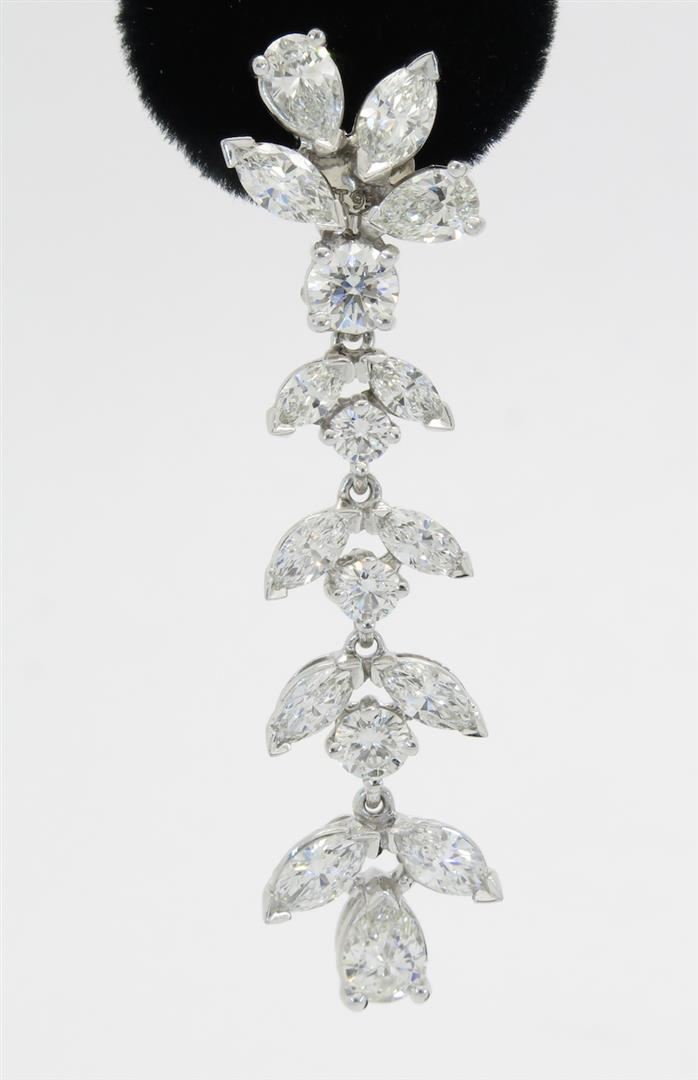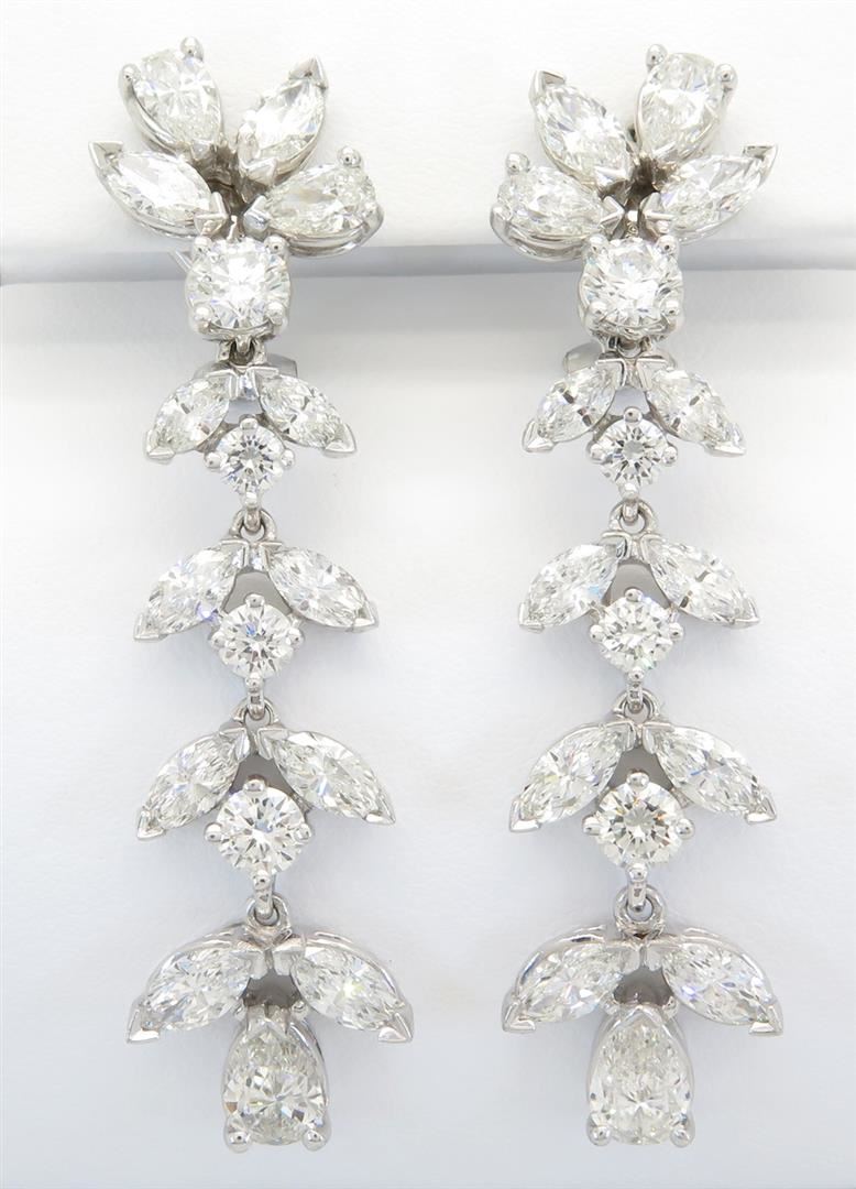 One tested pair of platinum designer Kwiat diamond earrings. Containing: 6 Pear Cut Diamonds, 8 Round Brilliant Cut Diamonds, 20 Marquise Cut Diamonds. Clarity: VS-SI, Color: G-I. Approximate total diamond weight: 8.75CTW. All diamonds are graded in the mounting unless otherwise stated. Weight of earrings 22.2 grams. The earrings have 18K white gold posts.