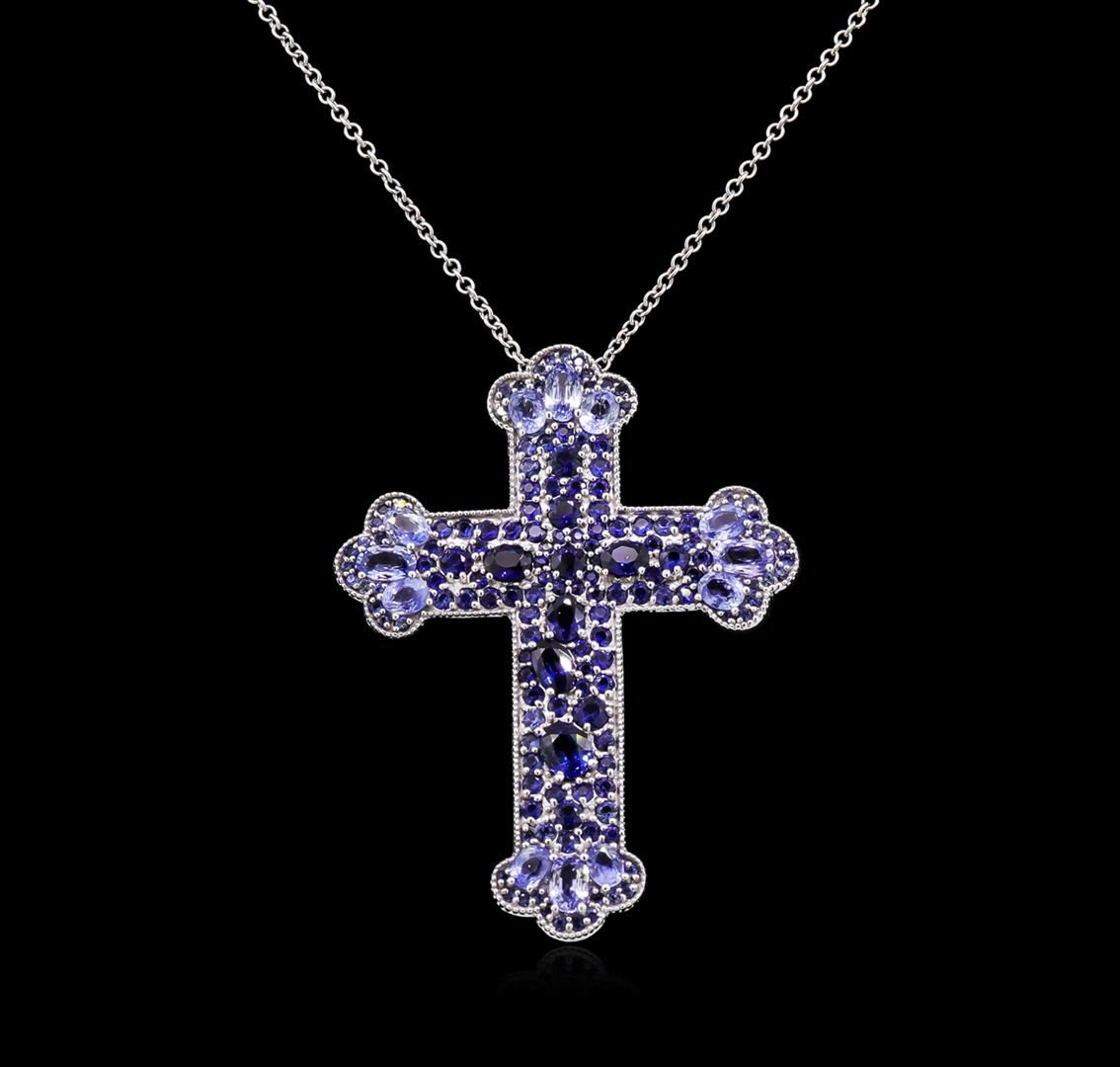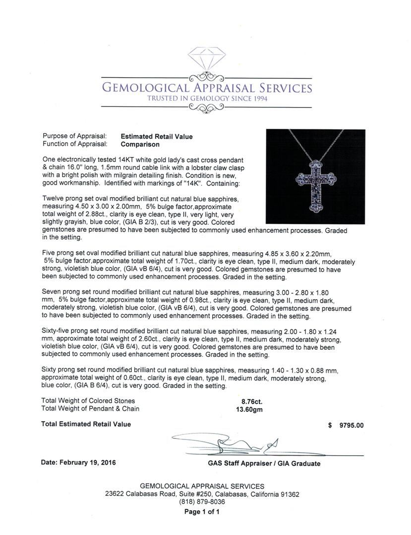 One electronically tested 14KT white gold lady's cast cross pendant & chain 16.0" long, 1.5mm round cable link with a lobster claw clasp with a bright polish with milgrain detailing finish. Identified with markings of "14K". Condition is new, good workmanship. Containing: Twelve prong set oval modified brilliant cut natural blue sapphires, measuring 4.50 x 3.00 x 2.00mm, 5%. bulge factor, approximate total weight of 2.88ct., clarity is eye clean, type II, very light, very slightly grayish, blue color, (GIA B 2/3), cut is very good. Colored gemstones are presumed to have been subjected to commonly used enhancement processes. Graded in the setting. Five prong set oval modified brilliant cut natural blue sapphires, measuring 4.85 x 3.60 x 2.20mm, 5%. bulge factor, approximate total weight of 1.70ct., clarity is eye clean, type II, medium dark, moderately strong, violetish blue color, (GIA vB 6/4), cut is very good. Colored gemstones are presumed to have been subjected to commonly used enhancement processes. Graded in the setting. Seven prong set round modified brilliant cut natural blue sapphires, measuring 3.00 - 2.80 x 1.80 mm, 5%. bulge factor, approximate total weight of 0.98ct., clarity is eye clean, type II, medium dark, moderately strong, violetish blue color, (GIA vB 6/4), cut is very good. Colored gemstones are presumed to have been subjected to commonly used enhancement processes. Graded in the setting. Sixty-five prong set round modified brilliant cut natural blue sapphires, measuring 2.00 - 1.80 x 1.24 mm, approximate total weight of 2.60ct., clarity is eye clean, type II, medium dark, moderately strong, violetish blue color, (GIA vB 6/4), cut is very good. Colored gemstones are presumed to have been subjected to commonly used enhancement processes. Graded in the setting. Sixty prong set round modified brilliant cut natural blue sapphires, measuring 1.40 - 1.30 x 0.88 mm, approximate total weight of 0.60ct., clarity is eye clean, type II, medium dark, moderately strong, blue color, (GIA B 6/4), cut is very good. Graded in the setting. Total Weight of Colored Stones 8.76ct. Total Weight of Pendant & Chain 13.60gm. GAS Appraised at $9,795.00.