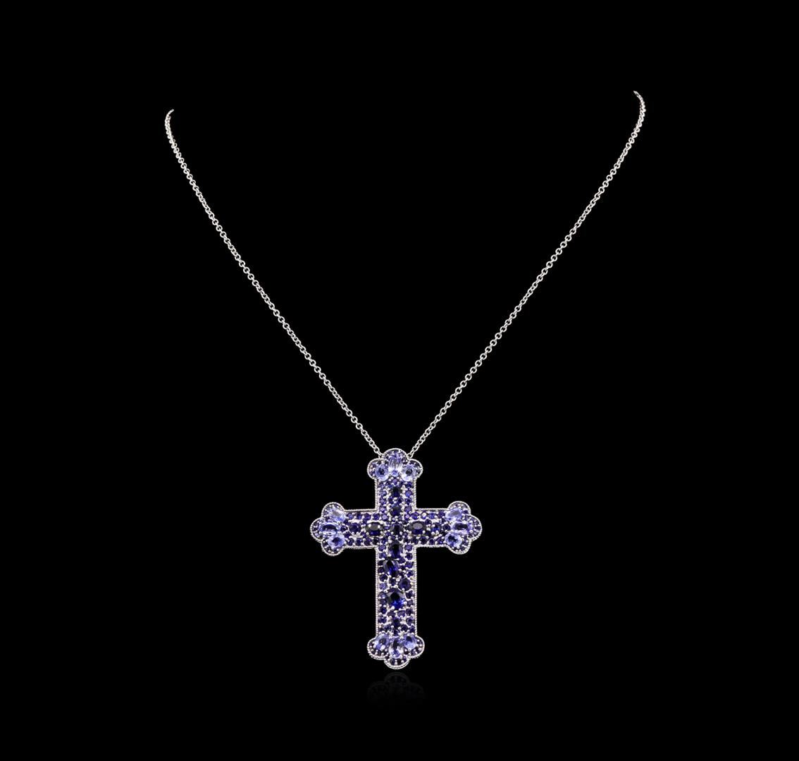 One electronically tested 14KT white gold lady's cast cross pendant & chain 16.0" long, 1.5mm round cable link with a lobster claw clasp with a bright polish with milgrain detailing finish. Identified with markings of "14K". Condition is new, good workmanship. Containing: Twelve prong set oval modified brilliant cut natural blue sapphires, measuring 4.50 x 3.00 x 2.00mm, 5%. bulge factor, approximate total weight of 2.88ct., clarity is eye clean, type II, very light, very slightly grayish, blue color, (GIA B 2/3), cut is very good. Colored gemstones are presumed to have been subjected to commonly used enhancement processes. Graded in the setting. Five prong set oval modified brilliant cut natural blue sapphires, measuring 4.85 x 3.60 x 2.20mm, 5%. bulge factor, approximate total weight of 1.70ct., clarity is eye clean, type II, medium dark, moderately strong, violetish blue color, (GIA vB 6/4), cut is very good. Colored gemstones are presumed to have been subjected to commonly used enhancement processes. Graded in the setting. Seven prong set round modified brilliant cut natural blue sapphires, measuring 3.00 - 2.80 x 1.80 mm, 5%. bulge factor, approximate total weight of 0.98ct., clarity is eye clean, type II, medium dark, moderately strong, violetish blue color, (GIA vB 6/4), cut is very good. Colored gemstones are presumed to have been subjected to commonly used enhancement processes. Graded in the setting. Sixty-five prong set round modified brilliant cut natural blue sapphires, measuring 2.00 - 1.80 x 1.24 mm, approximate total weight of 2.60ct., clarity is eye clean, type II, medium dark, moderately strong, violetish blue color, (GIA vB 6/4), cut is very good. Colored gemstones are presumed to have been subjected to commonly used enhancement processes. Graded in the setting. Sixty prong set round modified brilliant cut natural blue sapphires, measuring 1.40 - 1.30 x 0.88 mm, approximate total weight of 0.60ct., clarity is eye clean, type II, medium dark, moderately strong, blue color, (GIA B 6/4), cut is very good. Graded in the setting. Total Weight of Colored Stones 8.76ct. Total Weight of Pendant & Chain 13.60gm. GAS Appraised at $9,795.00.