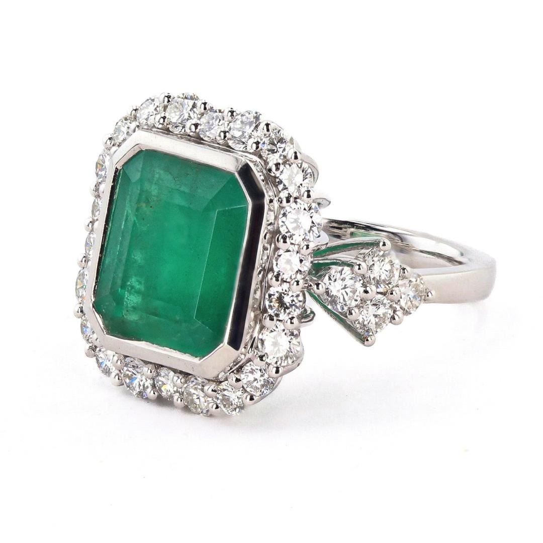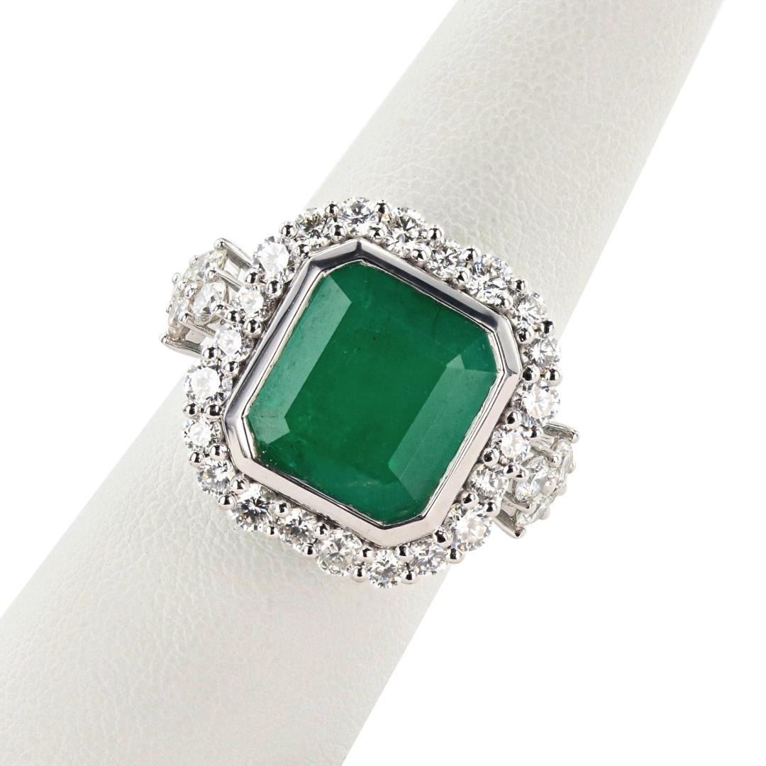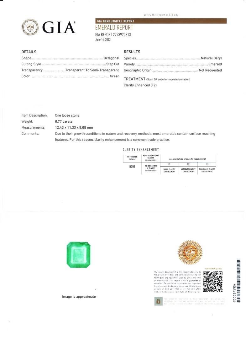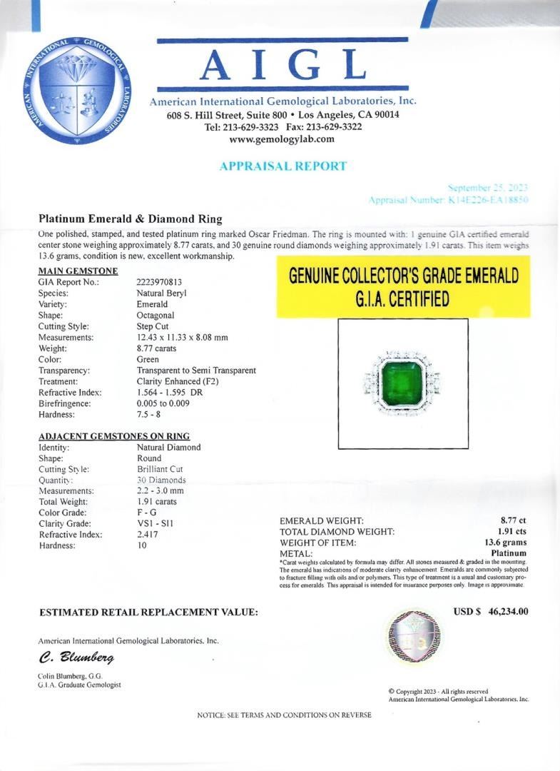 One polished. stamped, and tested platinum ring marked Oscar Friedman. The ring is mounted with: 1 genuine GIA certified emerald center stone weighing approximately 8.77 carats, and 30 genuine round diamonds weighing approximately 1.91 carats. This item weighs 13.6 grams, condition is new, excellent workmanship. #MAIN GEMSTONE# GIA Report No.: 2223970813; Species: Natural Beryl; Variety: Emerald; Shape: Octagonal; Cutting Style: Step Cut; Measurements: 12.43 x 11.33 x 8.08mm; Weight: 8.77 carats; Color: Green; Transparency: Transparent to Semi Transparent; Treatment: Clarity Enhanced (F2); Refractive Index: 1.564 - 1.595 DR; Birefringence: 0.005 to 0.009; Hardness: 7.5 - 8 #ADJACENT GEMSTONES ON RING# Identity: Natural Diamond; Shape: Round; Cutting Style: Brilliant Cut; Quantity: 30 Diamonds; Measurements: 2.2 - 3.0mm; Total Weight: 1.91 carats; Color Grade: F-G; Clarity Grade: VS1 - SI1; Refractive Index: 2.417; Hardness: 10; EMERALD WEIGHT: 8.77 ct; TOTAL DIAMOND WEIGHT: 1.91 cts; WEIGHT OF ITEM: 13.6 grams; METAL: Platinum #Size: 6 3/4