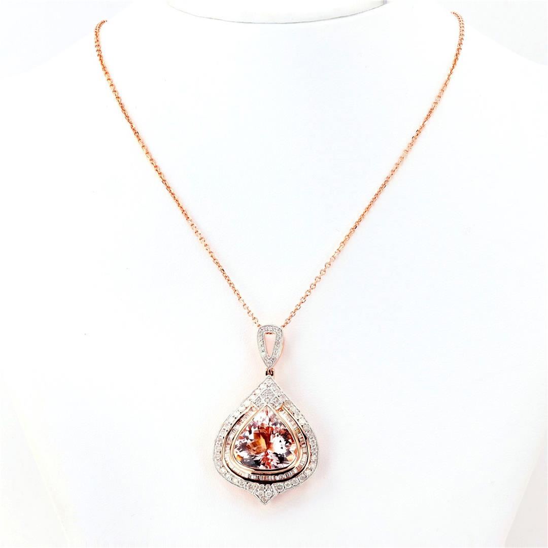 8.77ct Morganite and 1.44ctw Diamond 14K Rose Gold Pendant/Necklace. Please see Photos and Description for all available information. This necklace was designed to have the perfect balance between simplicity and elegance. The pendant features a 8.77ct Morganite gemstone and 136 round diamonds. It has a total diamond weight of 1.44ctw and is set in 14K Rose Gold. The pendant is suspended from an 18-inch rose gold chain.
