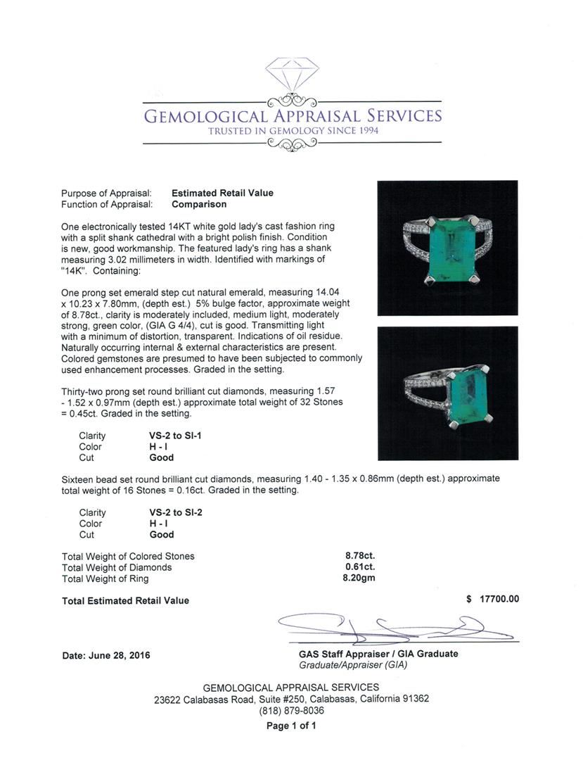 One electronically tested 14KT white gold lady's cast fashion ring with a split shank cathedral with a bright polish finish. The featured lady's ring has a shank measuring 3.02 millimeters in width. Identified with markings of "14K". Condition is new, good workmanship. Containing: One prong set emerald step cut natural emerald, measuring 14.04 x 10.23 x 7.80mm, (depth est.) 5%. bulge factor, approximate weight of 8.78ct., clarity is moderately included, medium light, moderately strong, green color, (GIA G 4/4), cut is good. Transmitting light with a minimum of distortion, transparent. Indications of oil residue. Naturally occurring internal & external characteristics are present. Colored gemstones are presumed to have been subjected to commonly used enhancement processes. Graded in the setting. Thirty-Two prong set round brilliant cut diamonds, measuring 1.57 - 1.52 x 0.97mm (depth est.) approximate total weight of 32 Stones = 0.45ct. Graded in the setting. Clarity: VS-2 to SI-1. Color: H - I. Cut Good Sixteen bead set round brilliant cut diamonds, measuring 1.40 - 1.35 x 0.86mm (depth est.) approximate total weight of 16 Stones = 0.16ct. Graded in the setting. Clarity: VS-2 to SI-2. Color: H - I. Cut Good. Total Weight of Colored Stones 8.78ct. Total Weight of Diamonds 0.61ct. Total Weight of Ring 8.20gm. GAS Appraised at $17,700.00.
