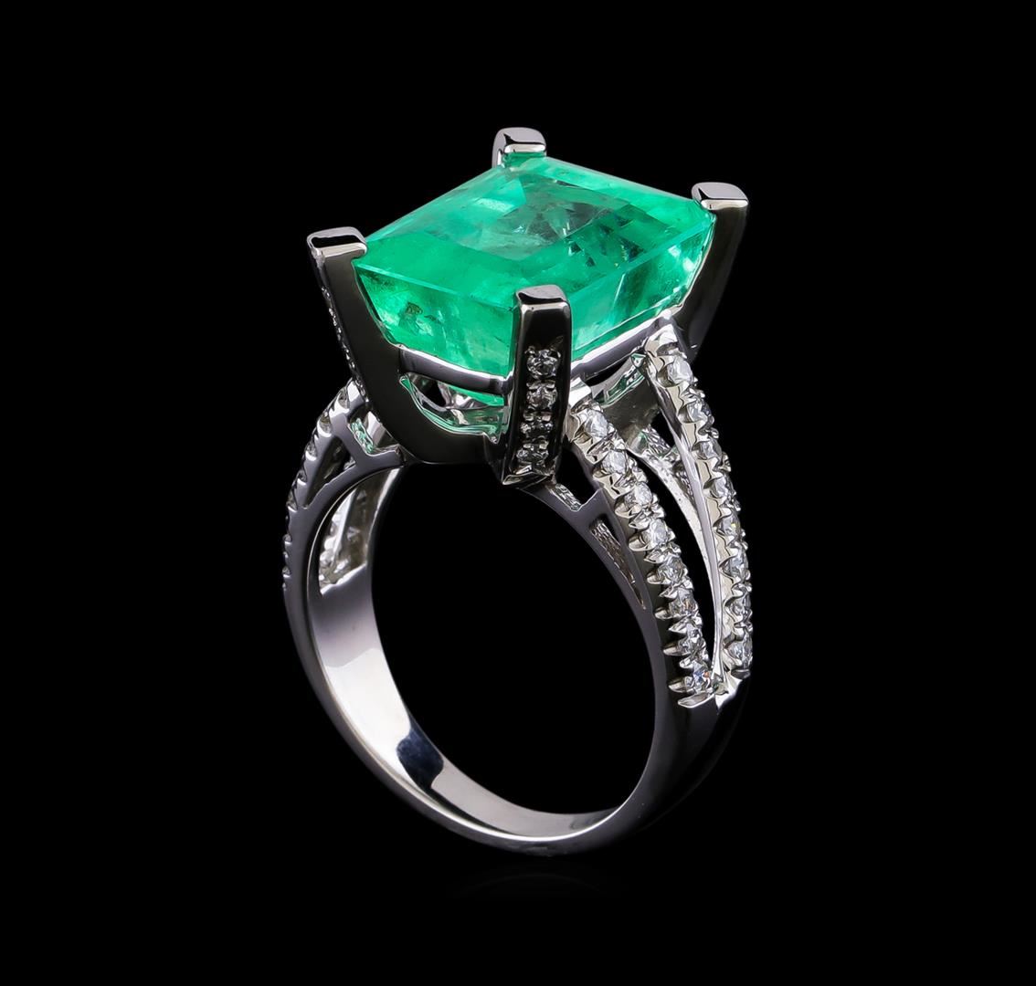 One electronically tested 14KT white gold lady's cast fashion ring with a split shank cathedral with a bright polish finish. The featured lady's ring has a shank measuring 3.02 millimeters in width. Identified with markings of "14K". Condition is new, good workmanship. Containing: One prong set emerald step cut natural emerald, measuring 14.04 x 10.23 x 7.80mm, (depth est.) 5%. bulge factor, approximate weight of 8.78ct., clarity is moderately included, medium light, moderately strong, green color, (GIA G 4/4), cut is good. Transmitting light with a minimum of distortion, transparent. Indications of oil residue. Naturally occurring internal & external characteristics are present. Colored gemstones are presumed to have been subjected to commonly used enhancement processes. Graded in the setting. Thirty-Two prong set round brilliant cut diamonds, measuring 1.57 - 1.52 x 0.97mm (depth est.) approximate total weight of 32 Stones = 0.45ct. Graded in the setting. Clarity: VS-2 to SI-1. Color: H - I. Cut Good Sixteen bead set round brilliant cut diamonds, measuring 1.40 - 1.35 x 0.86mm (depth est.) approximate total weight of 16 Stones = 0.16ct. Graded in the setting. Clarity: VS-2 to SI-2. Color: H - I. Cut Good. Total Weight of Colored Stones 8.78ct. Total Weight of Diamonds 0.61ct. Total Weight of Ring 8.20gm. GAS Appraised at $17,700.00.