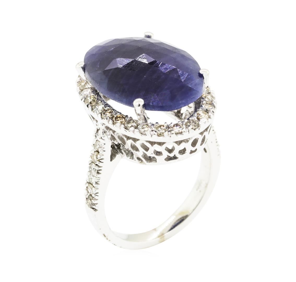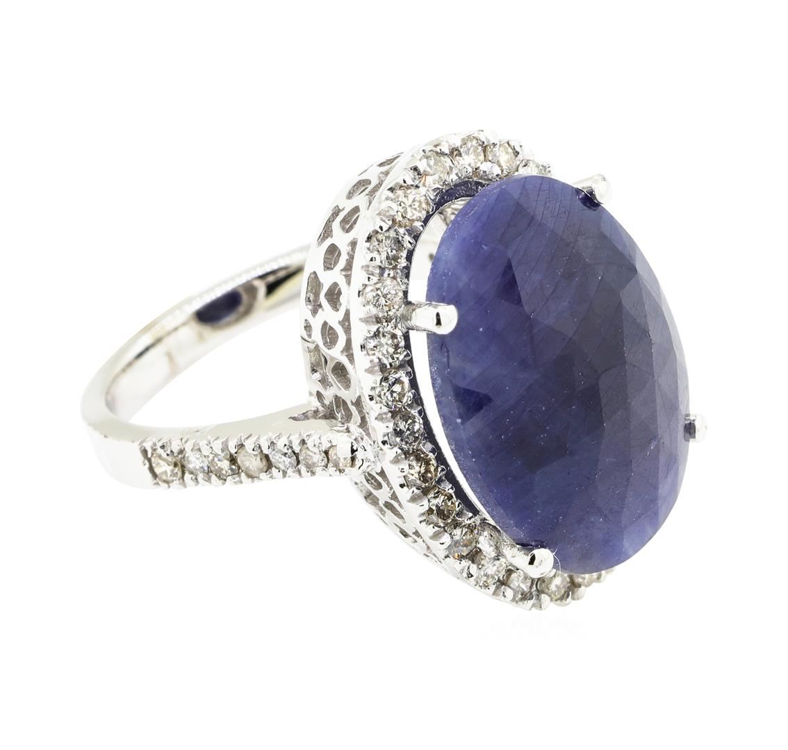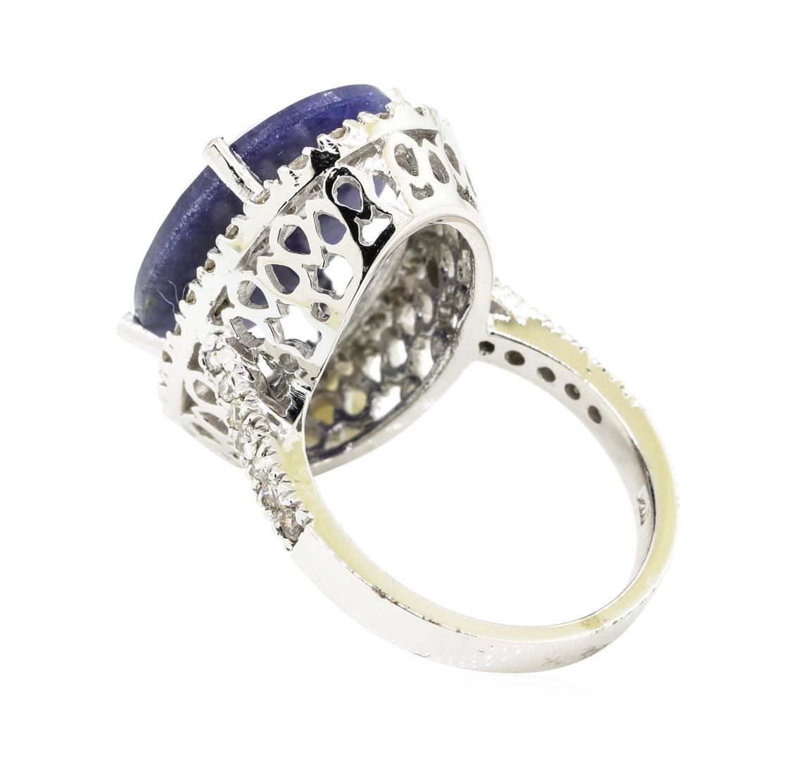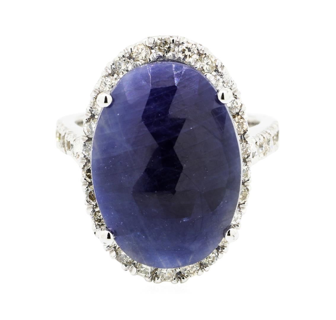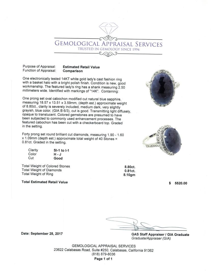One electronically tested 14KT white gold lady's cast fashion ring with a basket halo with a bright polish finish. The featured lady's ring has a shank measuring 2.50 millimeters wide. Identified with markings of '14K'. Condition is new, good workmanship. Containing: One prong set oval cabochon modified cut natural blue sapphire, measuring 18.57 x 13.51 x 3.59mm, (depth est.) approximate weight of 8.80ct., clarity is severely included, medium dark, very slightly grayish, blue color, (GIA B 6/3), cut is good. Transmitting light diffusely, opaque to translucent. Colored gemstones are presumed to have been subjected to commonly used enhancement processes. The featured cabochon has been cut with a checkerboard top. Graded in the setting. Forty prong set round brilliant cut diamonds, measuring 1.90 - 1.60 x 1.09mm (depth est.) approximate total weight of 40 Stones = 0.81ct. Graded in the setting. Color H - J Clarity SI-1 to I-1 Cut Good. Total Weight of Colored Stones 8.80ct.. Total Weight of Diamonds 0.81ct.. Total Weight of Ring 8.10gm GAS Appraised at $5520.00. GAS Appraised at $5,520.00.