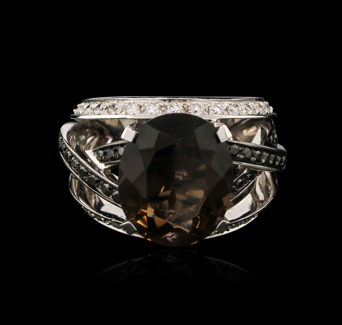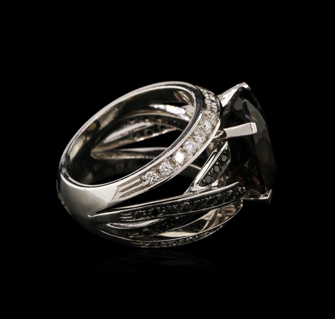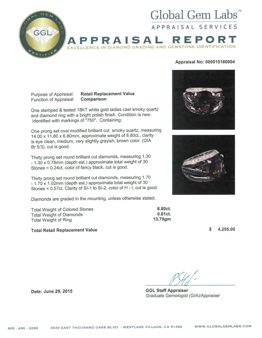 One stamped & tested 18KT white gold ladies cast smoky quartz and diamond ring with a bright polish finish. Identified with markings of "750". Condition is new. Containing: One prong set oval modified brilliant cut smoky quartz, measuring 14.00 x 11.80 x 6.80mm, approximate weight of 8.80ct., clarity is eye clean, medium, very slightly grayish, brown color, (GIA Br 5/3), cut is good. Thirty prong set round brilliant cut diamonds, measuring 1.30 - 1.30 x 0.78mm (depth est.) approximate total weight of 30 Stones = 0.24ct. Cut is Good. Thirty prong set round brilliant cut diamonds, measuring 1.70 - 1.70 x 1.02mm (depth est.) approximate total weight of 30 Stones = 0.57ct. Clarity: SI-1 to SI-2. Color: H - I, Cut is Good. Diamonds are graded in the mounting, unless otherwise stated. Total Weight of Colored Stones 8.80ct. Total Weight of Diamonds 0.81ct. Total Weight of Ring 13.70 grams. GGL Appraised at $4,255.00.