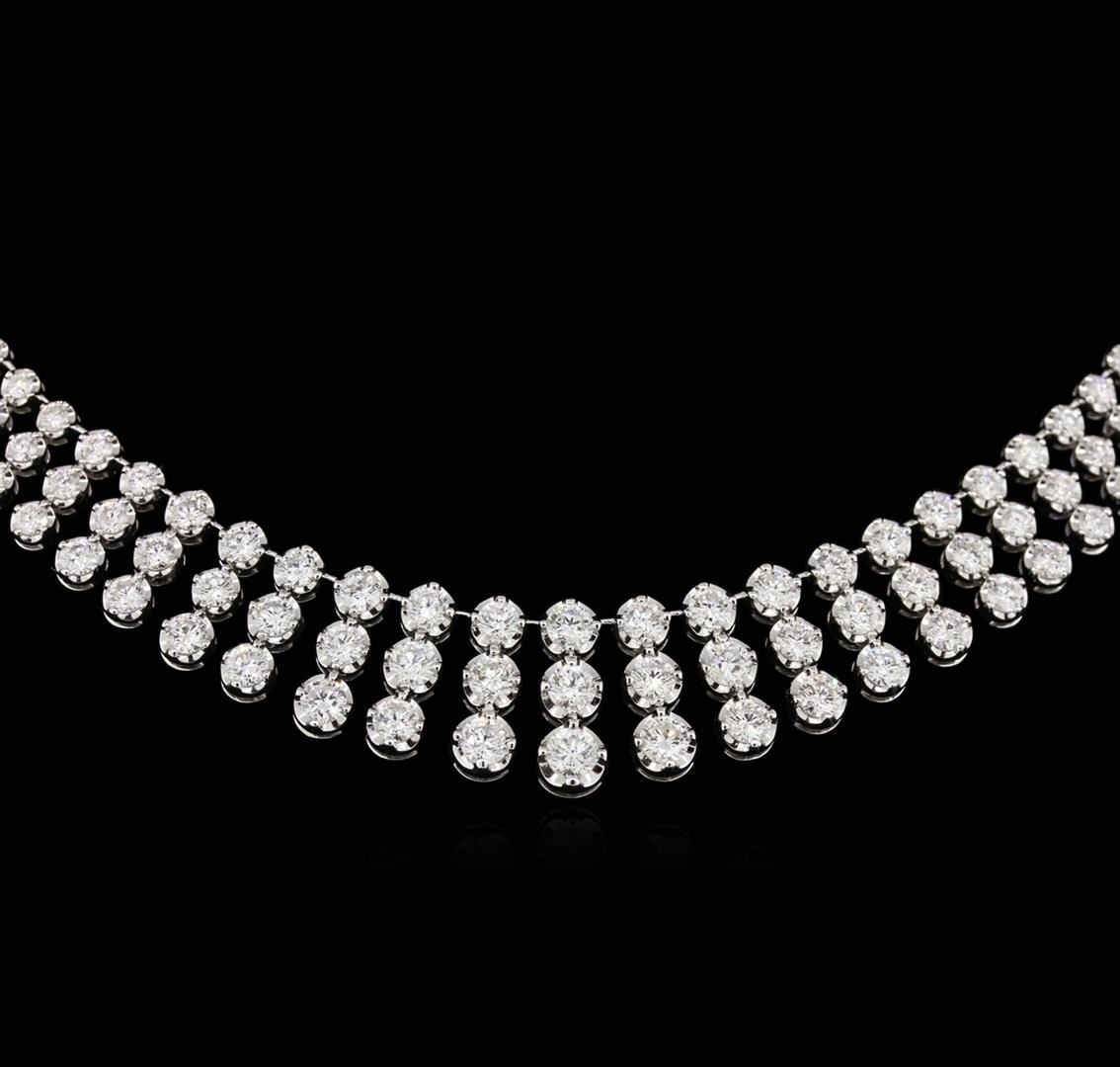 One electronically tested 18KT white gold lady's combination cast & assembled fashion necklace with a tongue clasp with foldover safety with a bright polish finish. The featured lady's necklace measures approximately 17 inches in length. Identified with markings of "18K". Condition is new, good workmanship. Containing: Fifteen prong set round brilliant cut diamonds, measuring 3.80 - 3.40 x 2.23mm (depth est.) approximate total weight of 15 Stones = 2.65ct. Graded in the setting. Clarity: VS-2 to SI-1. Color: H - I. Cut Good Eighteen prong set round brilliant cut diamonds, measuring 3.30 - 2.80 x 1.89mm (depth est.) approximate total weight of 18 Stones = 1.95ct. Graded in the setting. Clarity: SI-1 to SI-2. Color: H - I. Cut Good Thirty prong set round brilliant cut diamonds, measuring 2.30 - 2.10 x 1.36mm (depth est.) approximate total weight of 30 Stones = 1.20ct. Graded in the setting. Clarity: SI-1 to SI-2. Color: H - I. Cut Good One Hundred Two prong set round brilliant cut diamonds, measuring 2.00 - 1.95 x 1.21mm (depth est.) approximate total weight of 102 Stones = 3.00ct. Graded in the setting. Clarity: VS-2 to SI-1. Color: H - I. Cut Good. Total Weight of Diamonds 8.80ct. Total Weight of Necklace 56.40gm. GAS Appraised at $32,425.00.