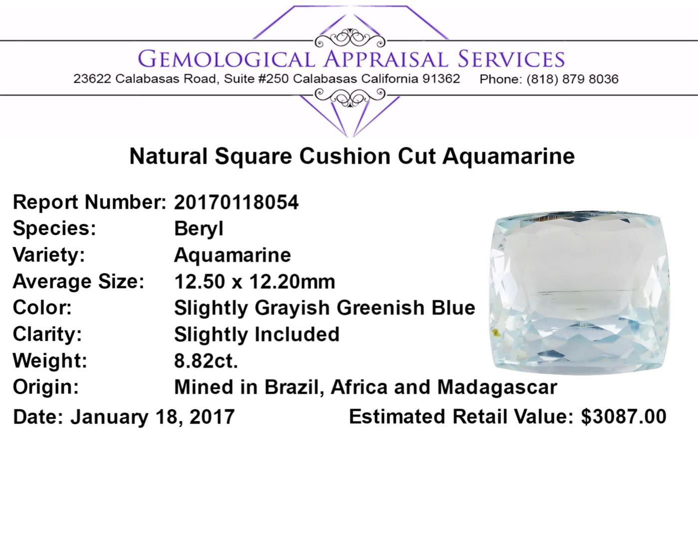 One natural square cushion cut aquamarine with an exact weight of 8.82ct., clarity is slightly included, slightly grayish greenish blue. Gemological Appraisals Services estimates the retail value at $3087 GAS Appraised.