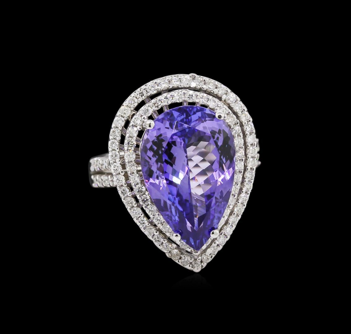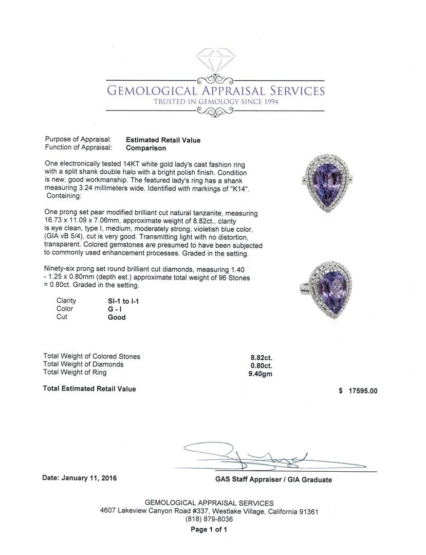 One electronically tested 14KT white gold lady's cast fashion ring with a split shank double halo with a bright polish finish. The featured lady's ring has a shank measuring 3.24 millimeters wide. Identified with markings of "K14". Condition is new, good workmanship. Containing: One prong set pear modified brilliant cut natural tanzanite, measuring 16.73 x 11.09 x 7.06mm, approximate weight of 8.82ct., clarity is eye clean, type I, medium, moderately strong, violetish blue color, (GIA vB 5/4), cut is very good. Transmitting light with no distortion, transparent. Colored gemstones are presumed to have been subjected to commonly used enhancement processes. Graded in the setting. Ninety-Six prong set round brilliant cut diamonds, measuring 1.40 - 1.25 x 0.80mm (depth est.) approximate total weight of 96 Stones = 0.80ct. Graded in the setting. Clarity: SI-1 to I-1. Color: G - I. Cut Good. Total Weight of Colored Stones 8.82ct. Total Weight of Diamonds 0.80ct. Total Weight of Ring 9.40gm. GAS Appraised at $17,595.00.