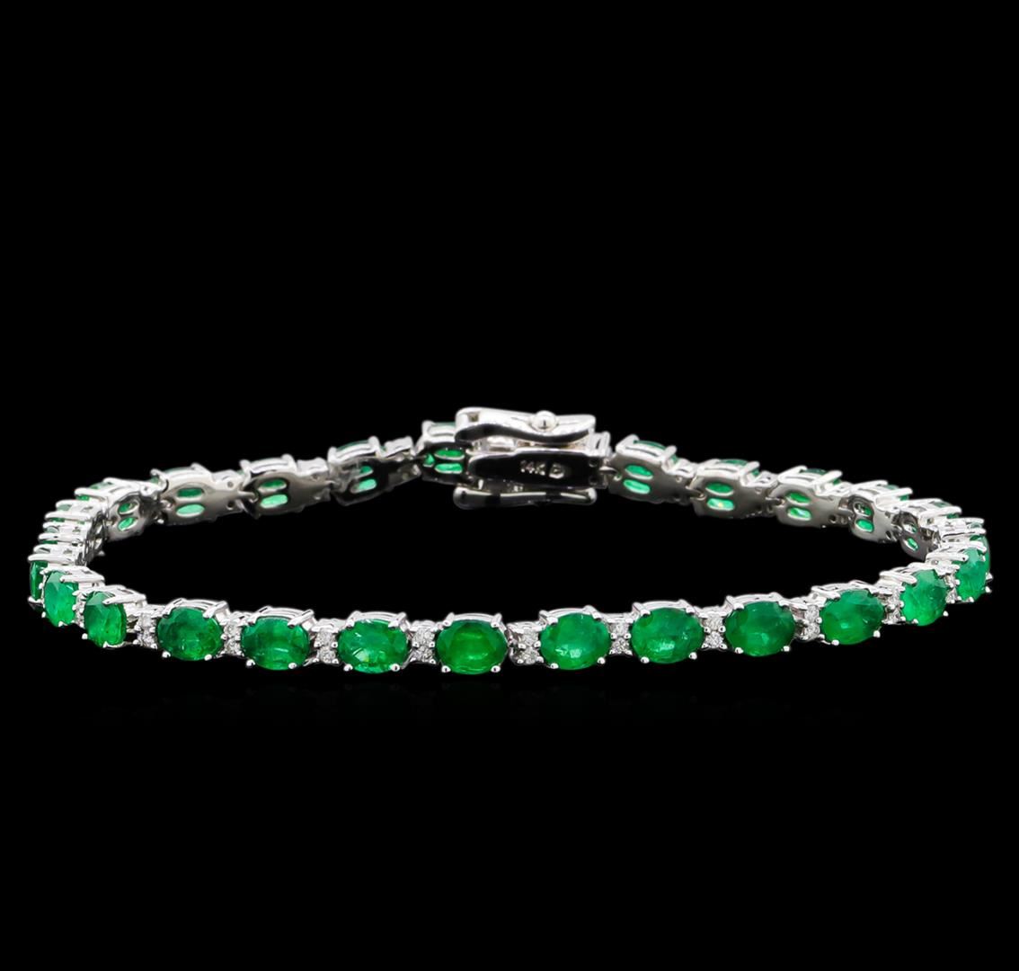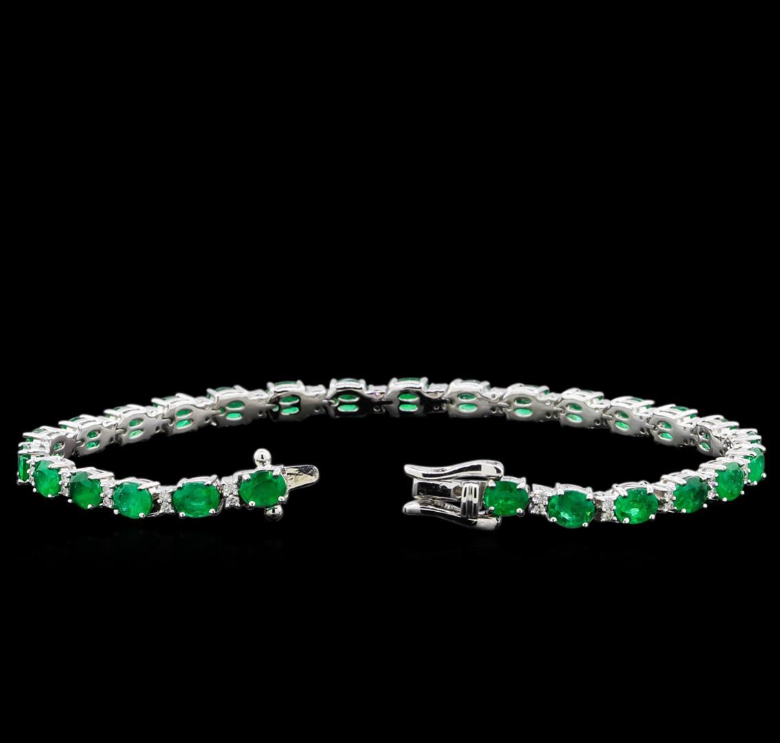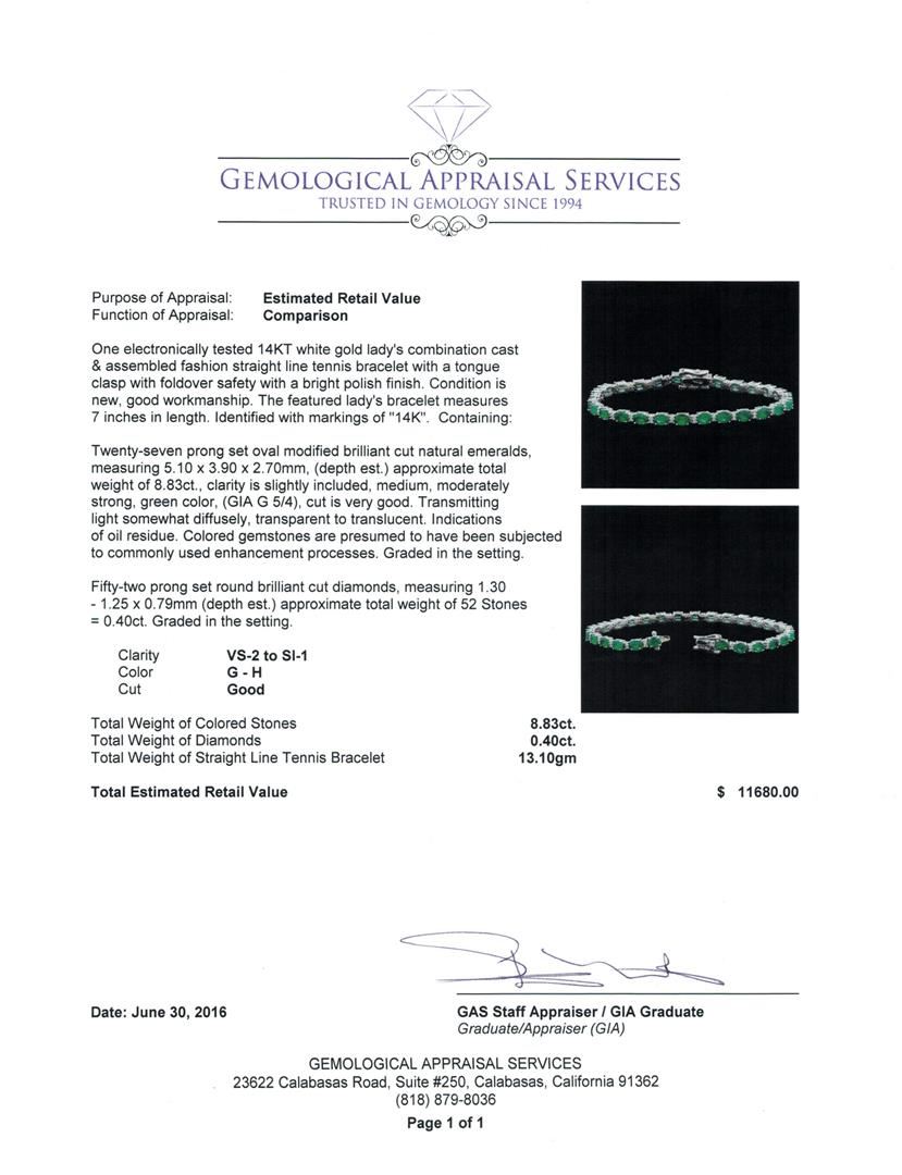 One electronically tested 14KT white gold lady's combination cast & assembled fashion straight line tennis bracelet with a tongue clasp with foldover safety with a bright polish finish. The featured lady's bracelet measures 7 inches in length. Identified with markings of "14K". Condition is new, good workmanship. Containing: Twenty-seven prong set oval modified brilliant cut natural emeralds, measuring 5.10 x 3.90 x 2.70mm, (depth est.) approximate total weight of 8.83ct., clarity is slightly included, medium, moderately strong, green color, (GIA G 5/4), cut is very good. Transmitting light somewhat diffusely, transparent to translucent. Indications of oil residue. Colored gemstones are presumed to have been subjected to commonly used enhancement processes. Graded in the setting. Fifty-Two prong set round brilliant cut diamonds, measuring 1.30 - 1.25 x 0.79mm (depth est.) approximate total weight of 52 Stones = 0.40ct. Graded in the setting. Clarity: VS-2 to SI-1. Color: G - Good. Total Weight of Colored Stones 8.83ct. Total Weight of Diamonds 0.40ct. Total Weight of Straight Line Tennis Bracelet 13.10gm. GAS Appraised at $11,680.00.