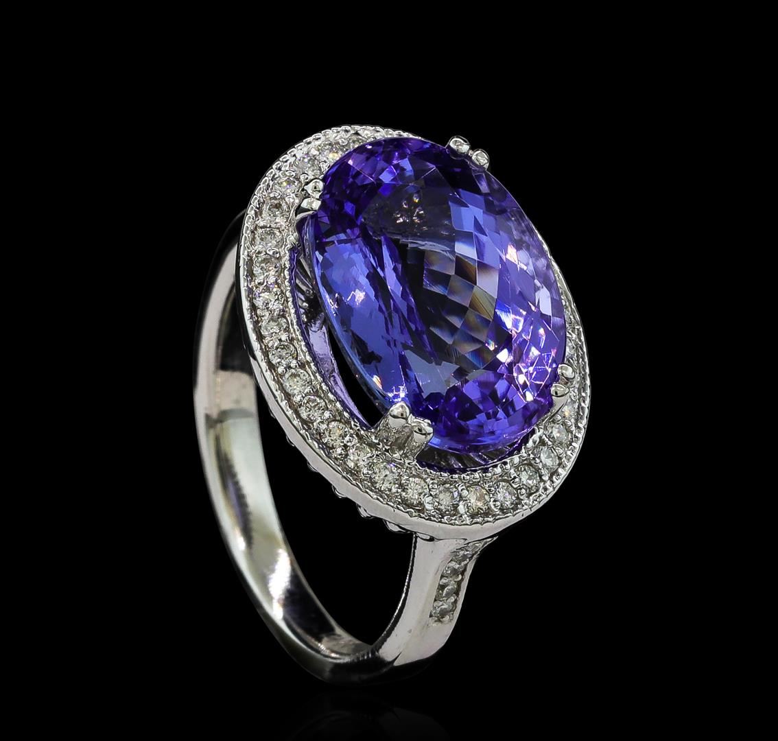 One electronically tested 14KT white gold lady's cast fashion ring with a cathedral halo with a bright polish with milgrain detailing finish. The featured lady's ring has a shank measuring 2.64 millimeters wide. Identified with markings of '14K'. Condition is new, good workmanship. Containing: One prong set oval modified brilliant cut natural tanzanite, measuring 14.16 x 10.20 x 7.55mm, (depth est.) 15%. bulge factor, approximate weight of 8.84ct., clarity is eye clean, medium light, very slightly grayish, violet color, (GIA V 4/3), cut is very good. Transmitting light with no distortion, transparent. Colored gemstones are presumed to have been subjected to commonly used enhancement processes. Graded in the setting. Forty-Four prong set round brilliant cut diamonds, measuring 1.30 - 1.25 x 0.79mm (depth est.) approximate total weight of 44 Stones = 0.34ct. Graded in the setting. Clarity SI-1 to SI-2. Color: H - I Cut Good. Total Weight of Colored Stones 8.84ct.. Total Weight of Diamonds 0.34ct.. Total Weight of Ring 6.60gm. GAS Appraised at $10,560.00.
