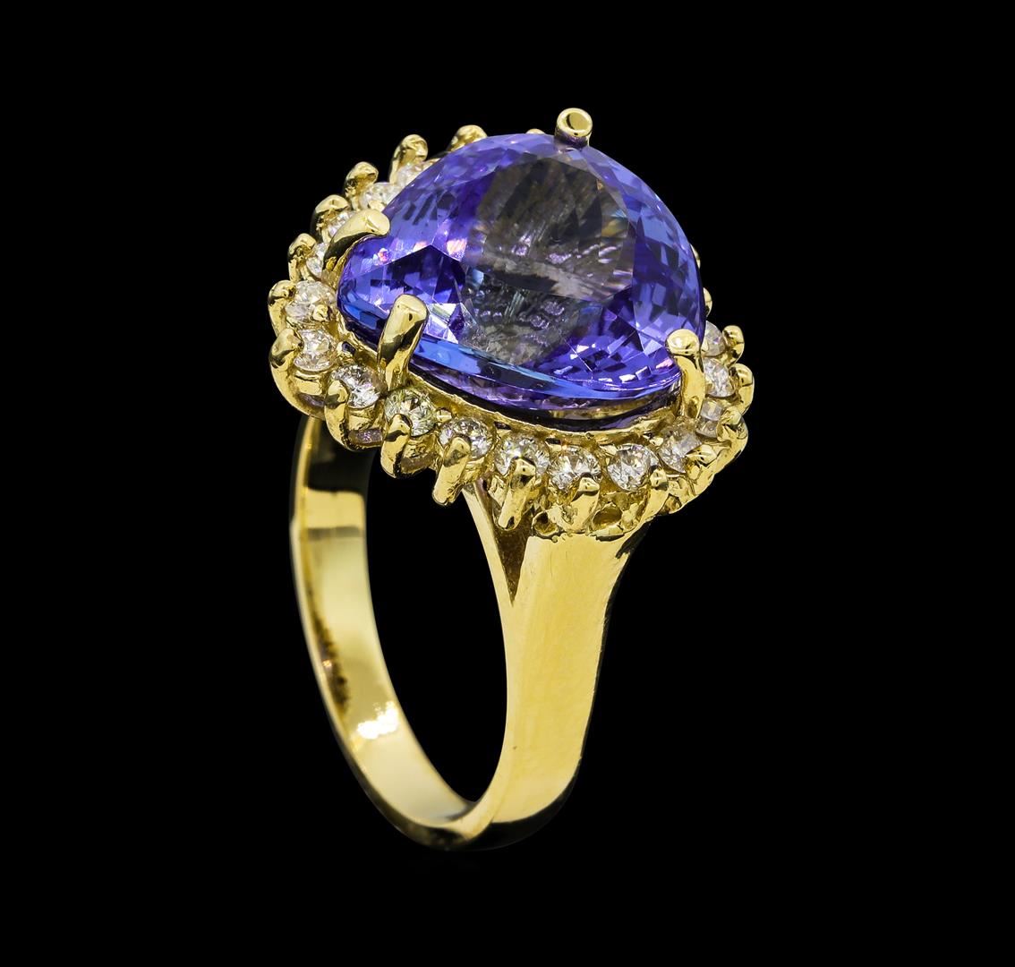 One electronically tested 14KT yellow gold lady's cast fashion ring with a basket halo with a bright polish finish. The featured lady's ring has a shank measuring 2.66 millimeters wide. Identified with markings of '14K'. Condition is new, good workmanship. Containing: One prong set pear modified brilliant cut natural tanzanite, measuring 12.92 x 13.50 x 7.85mm, (depth est.) approximate weight of 8.84ct., clarity is eye clean, medium light, very slightly grayish, violetish blue color, (GIA vB 4/3), cut is very good. Transmitting light with no distortion, transparent. Colored gemstones are presumed to have been subjected to commonly used enhancement processes. Graded in the setting. Twenty-Two prong set round brilliant cut diamonds, measuring 2.00 - 1.90 x 1.21mm (depth est.) approximate total weight of 22 Stones = 0.63ct. Graded in the setting. Clarity SI-1 to I-1. Color: G - I Cut Good. Total Weight of Colored Stones 8.84ct.. Total Weight of Diamonds 0.63ct.. Total Weight of Ring 8.10gm. GAS Appraised at $12,675.00.