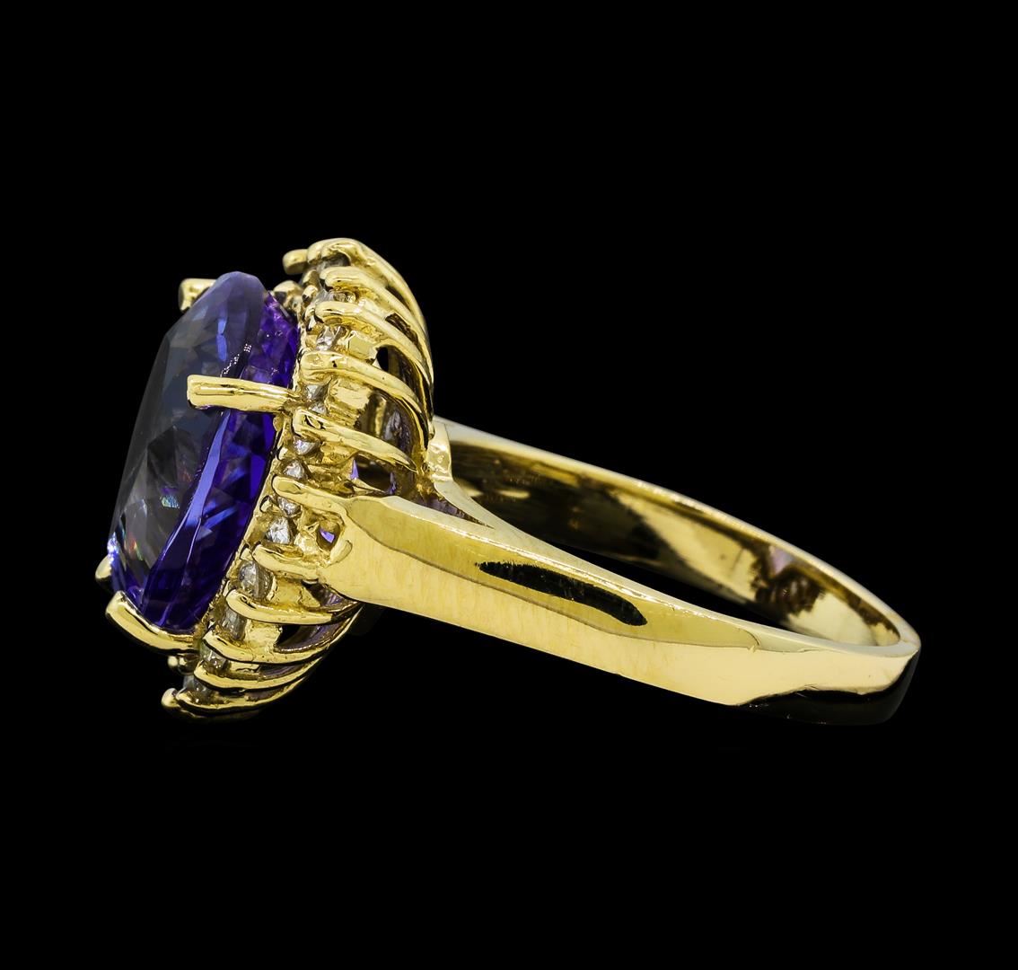 One electronically tested 14KT yellow gold lady's cast fashion ring with a basket halo with a bright polish finish. The featured lady's ring has a shank measuring 2.66 millimeters wide. Identified with markings of '14K'. Condition is new, good workmanship. Containing: One prong set pear modified brilliant cut natural tanzanite, measuring 12.92 x 13.50 x 7.85mm, (depth est.) approximate weight of 8.84ct., clarity is eye clean, medium light, very slightly grayish, violetish blue color, (GIA vB 4/3), cut is very good. Transmitting light with no distortion, transparent. Colored gemstones are presumed to have been subjected to commonly used enhancement processes. Graded in the setting. Twenty-Two prong set round brilliant cut diamonds, measuring 2.00 - 1.90 x 1.21mm (depth est.) approximate total weight of 22 Stones = 0.63ct. Graded in the setting. Clarity SI-1 to I-1. Color: G - I Cut Good. Total Weight of Colored Stones 8.84ct.. Total Weight of Diamonds 0.63ct.. Total Weight of Ring 8.10gm. GAS Appraised at $12,675.00.
