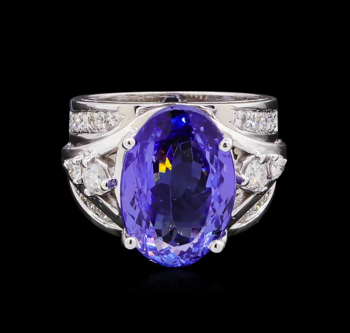 One electronically tested 14KT white gold lady's cast fashion ring with a tapered cathedral shank with a bright polish finish. The featured lady's ring has a shank measuring 4.30 millimeters wide. Identified with markings of "14K". Condition is new, good workmanship. Containing: One prong set oval modified brilliant cut natural tanzanite, measuring 16.24 x 11.15 x 6.39mm, 9%. bulge factor, approximate weight of 8.85ct., clarity is eye clean, type I, medium light, moderately strong, bluish violet color, (GIA bV 4/4), cut is good. Transmitting light with no distortion, transparent. Colored gemstones are presumed to have been subjected to commonly used enhancement processes. Graded in the setting. Two prong set round brilliant cut diamonds, measuring 3.10 - 3.05 x 1.91mm (depth est.) approximate total weight of 2 Stones = 0.22ct. Graded in the setting. Clarity: SI-2 to I-1. Color: H - I. Cut Good Two prong set round brilliant cut diamonds, measuring 2.20 - 2.15 x 1.37mm (depth est.) approximate total weight of 2 Stones = 0.08ct. Graded in the setting. Clarity: SI-1 to SI-2. Color: H - I. Cut Good Twenty prong set round brilliant cut diamonds, measuring 1.90 - 1.80 x 1.15mm (depth est.) approximate total weight of 20 Stones = 0.48ct. Graded in the setting. Clarity: VS-2 to SI-2. Color: H - I. Cut Good. Total Weight of Colored Stones 8.85ct. Total Weight of Diamonds 0.78ct. Total Weight of Ring 10.60gm. GAS Appraised at $12,700.00.